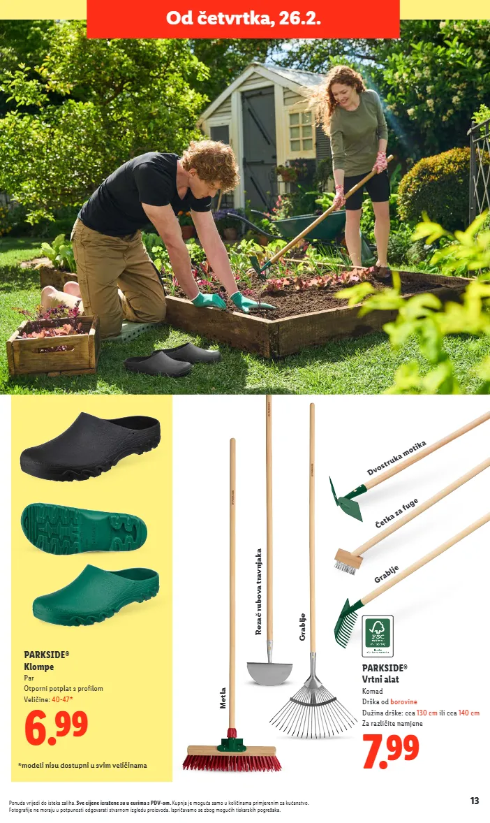 13 ponuda vrijedi do isteka zaliha. sve cijene izražene su u eurima s pdv-om. kupnja je moguća samo u količinama primjerenim za kućanstvo. fotografije ne moraju u potpunosti odgovarati stvarnom izgledu proizvoda. ispričavamo se zbog mogućih tiskarskih pogrešaka. od četvrtka, 26.2. 7.99 parkside® vrtni alat komad drška od borovine dužina drške: cca 130 cm ili cca 140 cm za različite namjene 6.99 parkside® klompe par otporni potplat s profilom veličine: 40-47* *modeli nisu dostupni u svim veličinama četka za fuge rezač rubova travnjaka grablje grablje metla dvostruka motika