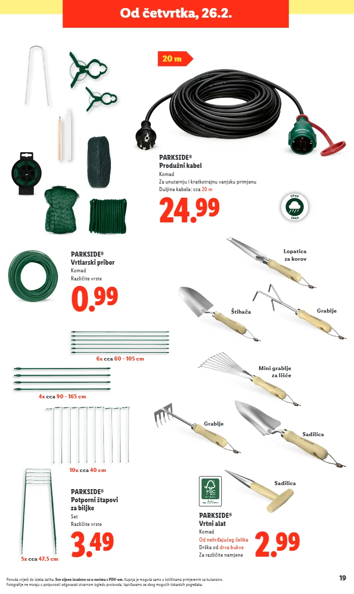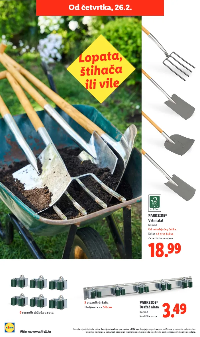 Ponuda vrijedi do isteka zaliha. Sve cijene izražene su u eurima s PDV-om. Kupnja je moguća samo u količinama primjerenim za kućanstvo. Fotografije ne moraju u potpunosti odgovarati stvarnom izgledu proizvoda. Ispričavamo se zbog mogućih tiskarskih pogrešaka. Više na www.lidl.hr 3.49 PARKSIDE® Dražač alata Komad Različite vrste 6 steznih držača u setu 5 steznih držača Duljina: cca 50 cm 18.99 PARKSIDE® Vrtni alat Komad Od nehrđajućeg čelika Drška od drva bukve Za različite namjene Lopata, štihača ili vile Od četvrtka, 26.2.