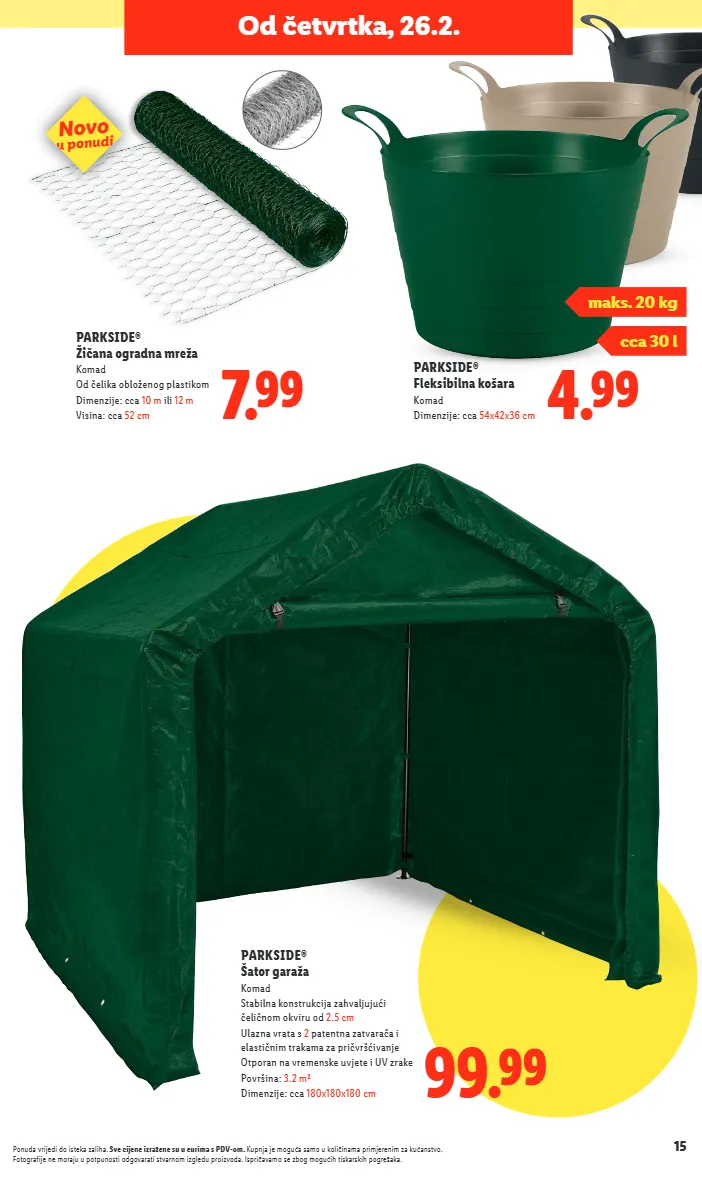 15 Ponuda vrijedi do isteka zaliha. Sve cijene izražene su u eurima s PDV-om. Kupnja je moguća samo u količinama primjerenim za kućanstvo. Fotografije ne moraju u potpunosti odgovarati stvarnom izgledu proizvoda. Ispričavamo se zbog mogućih tiskarskih pogrešaka. Od četvrtka, 26.2. 7.99 PARKSIDE® Žičana ogradna mreža Komad Od čelika obloženog plastikom Dimenzije: cca 10 m ili 12 m Visina: cca 52 cm 4.99 PARKSIDE® Fleksibilna košara Komad Dimenzije: cca 54x42x36 cm cca 30 l maks. 20 kg Novo u ponudi 99.99 PARKSIDE ® Šator garaža Komad Stabilna konstrukcija zahvaljujući čeličnom okviru od 2.5 cm Ulazna vrata s 2 patentna zatvarača i elastičnim trakama za pričvršćivanje Otporan na vremenske uvjete i UV zrake Površina: 3.2 m² Dimenzije: cca 180x180x180 cm