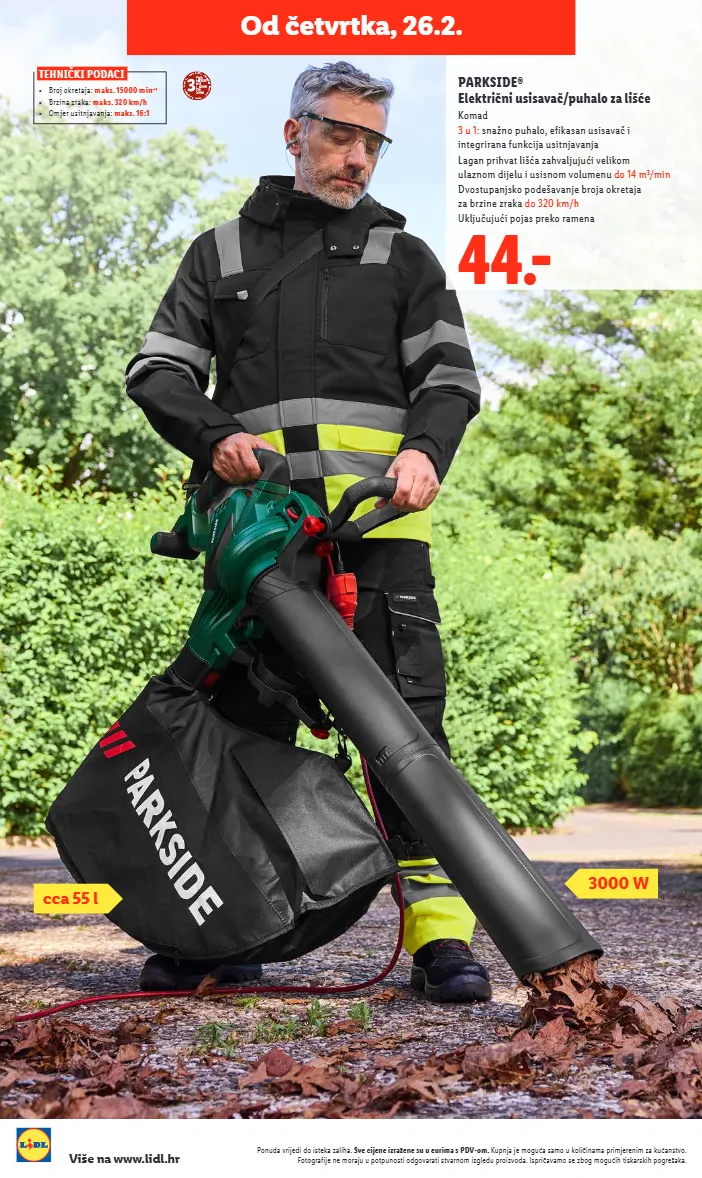 ponuda vrijedi do isteka zaliha. sve cijene izražene su u eurima s pdv-om. kupnja je moguća samo u količinama primjerenim za kućanstvo. fotografije ne moraju u potpunosti odgovarati stvarnom izgledu proizvoda. ispričavamo se zbog mogućih tiskarskih pogrešaka. više na www.lidl.hr tehnički podaci • broj okretaja: maks. 15000 min – 1 • brzina zraka: maks. 320 km/h • omjer usitnjavanja: maks. 16:1 3000 w cca 55 l 44.- parkside® električni usisavač/puhalo za lišće komad 3 u 1: snažno puhalo, efikasan usisavač i integrirana funkcija usitnjavanja lagan prihvat lišća zahvaljujući velikom ulaznom dijelu i usisnom volumenu do 14 m³/min dvostupanjsko podešavanje broja okretaja za brzine zraka do 320 km/h uključujući pojas preko ramena od četvrtka, 26.2.