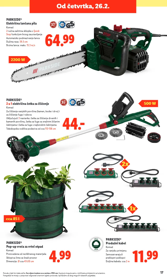 17 ponuda vrijedi do isteka zaliha. sve cijene izražene su u eurima s pdv-om. kupnja je moguća samo u količinama primjerenim za kućanstvo. fotografije ne moraju u potpunosti odgovarati stvarnom izgledu proizvoda. ispričavamo se zbog mogućih tiskarskih pogrešaka. 64.99 parkside® električna lančana pila komad 2 -ručna zaštitna sklopka s quick stop funkcijom brzog zaustavljanja automatsko podmazivanje lanca dužina reza: 39.5 cm brzina lanca: maks. 15.3 m/s 2200 w 11.99 parkside® produžni kabel komad za vanjsku primjenu samozatvarajući preklopni poklopci duljina kabela: cca 2 m 2x 1x 4.99 parkside® pop-up vreća za vrtni otpad komad proizvedena od recikliranog materijala sklopiva čime se štedi prostor dimenzije: ø cca 47x50 cm 44.- parkside® 2 u 1 električna četka za čišćenje komad za čišćenje vanjskih površina (kamen, kocke i drvo) i za čišćenje fuga i rubova uključujući 3 nastavka: četka za čišćenje drvenih i kamenih površina, četka za fuge sa snažnim žičanim čekinjama i četka za fuge s najlonskim čekinjama teleskopska vodilica podesiva od cca 113-136 cm 500 w i p 4 4 i p 4 4 od četvrtka, 26.2. cca 85 l