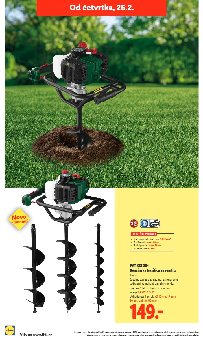 ponuda vrijedi do isteka zaliha. sve cijene izražene su u eurima s pdv-om. kupnja je moguća samo u količinama primjerenim za kućanstvo. fotografije ne moraju u potpunosti odgovarati stvarnom izgledu proizvoda. ispričavamo se zbog mogućih tiskarskih pogrešaka. više na www.lidl.hr tehnički podaci • praznohodna brzina vrtnje: 3000 min – 1 • dubina rada: maks. 80 cm • radni promjer: maks. 20 cm • radni obujam: 52 cm³ 149.- parkside® benzinska bušilica za zemlju komad idealna za rupe za sadnju, za pripremu točkastih temelja ili za rahljenje tla snažan 2 -taktni benzinski motor snage 1,4 kw ( 1,9 ks ) uključujući 3 svrdla ( ø 10 cm, 15 cm i 20 cm, duljine 80 cm ) od četvrtka, 26.2. novo u ponudi