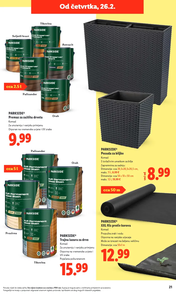21 ponuda vrijedi do isteka zaliha. sve cijene izražene su u eurima s pdv-om. kupnja je moguća samo u količinama primjerenim za kućanstvo. fotografije ne moraju u potpunosti odgovarati stvarnom izgledu proizvoda. ispričavamo se zbog mogućih tiskarskih pogrešaka. parkside® posuda za biljke komad s izvlačivim umetkom za bilje zapremnina za sadnju: dimenzije: cca 26,5x26,5x26,5 cm, maks. 11 l, 8.99 € dimenzije: cca 58 x 18 x 50 cm maks. 12 l , 19.99 € 8.99 već od 12.99 parkside® xxl flis protiv korova komad propušta zrak i vodu otporna na vanjske utjecaje može se izrezati na željenu veličinu dimenzije: cca 50x1 m cca 50 m tikovina orah palisander 9.99 parkside® premaz za zaštitu drveta komad za unutarnju i vanjsku primjenu otporan na vremenske uvjete i uv zrake 15.99 parkside® trajna lazura za drvo komad za unutarnju i vanjsku primjenu otporna na vremenske uvjete i uv zrake pojačana poliuretanom cca 5 l palisander svijetli hrast tikovina prozirna antracit od četvrtka, 26.2. orah cca 2.5 l