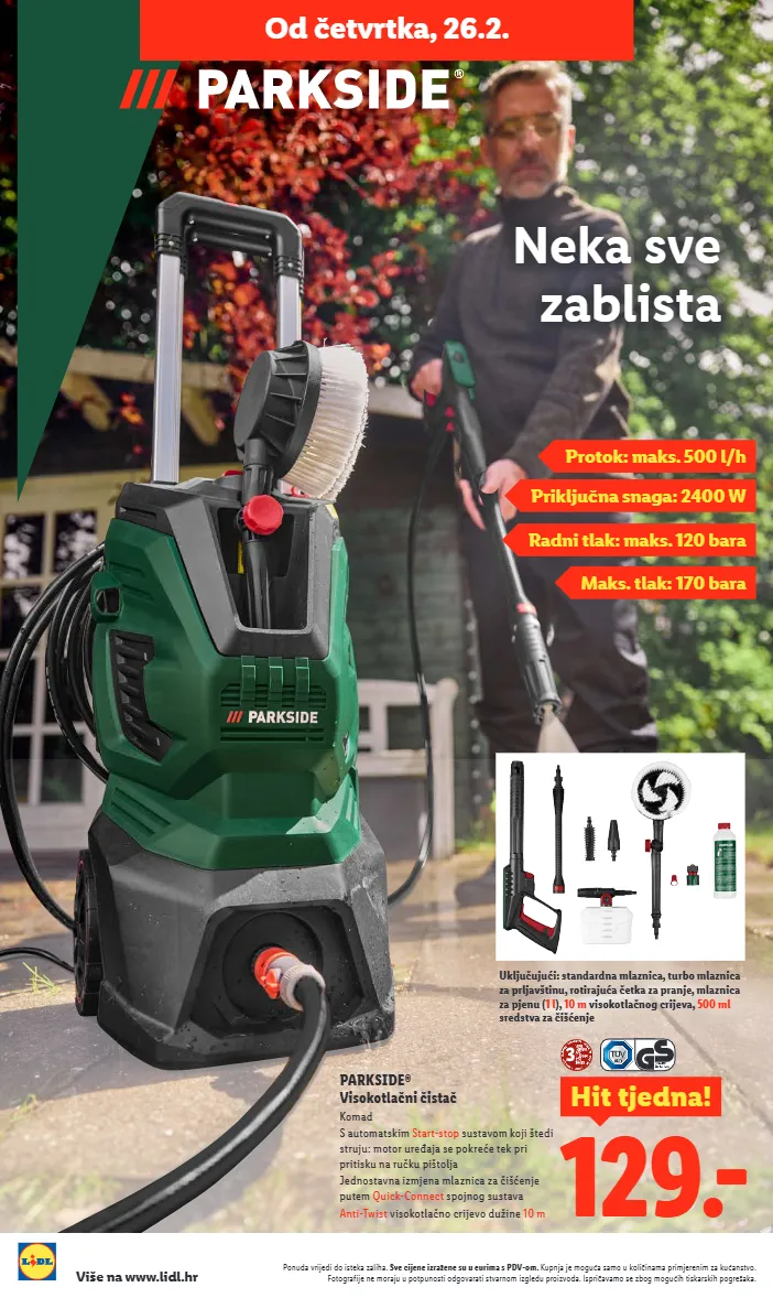 Ponuda vrijedi do isteka zaliha. Sve cijene izražene su u eurima s PDV-om. Kupnja je moguća samo u količinama primjerenim za kućanstvo. Fotografije ne moraju u potpunosti odgovarati stvarnom izgledu proizvoda. Ispričavamo se zbog mogućih tiskarskih pogrešaka. Više na www.lidl.hr 482149 129.- H it tjedna ! PARKSIDE® Visokotlačni čistač Komad S automatskim Start-stop sustavom koji štedi struju: motor uređaja se pokreće tek pri pritisku na ručku pištolja Jednostavna izmjena mlaznica za čišćenje putem Quick-Connect spojnog sustava Anti-Twist visokotlačno crijevo dužine 10 m Priključna snaga: 2400 W Maks. tlak: 170 bara Radni tlak: maks. 120 bara Protok: maks. 500 l/h Neka sve zablista Od četvrtka, 26.2. Uključujući: standardna mlaznica, turbo mlaznica za prljavštinu, rotirajuća četka za pranje, mlaznica za pjenu ( 1 l ), 10 m visokotlačnog crijeva, 500 ml sredstva za čišćenje