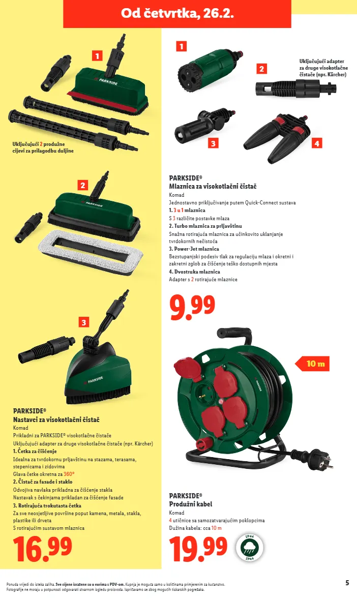5 Ponuda vrijedi do isteka zaliha. Sve cijene izražene su u eurima s PDV-om. Kupnja je moguća samo u količinama primjerenim za kućanstvo. Fotografije ne moraju u potpunosti odgovarati stvarnom izgledu proizvoda. Ispričavamo se zbog mogućih tiskarskih pogrešaka. Od četvrtka, 26.2. 9.99 PARKSIDE® Mlaznica za visokotlačni čistač Komad Jednostavno priključivanje putem Quick-Connect sustava 1. 3 u 1 mlaznica S 3 različite postavke mlaza 2. Turbo mlaznica za prljavštinu Snažna rotirajuća mlaznica za učinkovito uklanjanje tvrdokornih nečistoća 3. Power-Jet mlaznica Bezstupanjski podesiv tlak za regulaciju mlaza i okretni i zakretni zglob za čišćenje teško dostupnih mjesta 4. Dvostruka mlaznica Adapter s 2 rotirajuće mlaznice 3 1 1 2 3 4 2 19.99 PARKSIDE® Produžni kabel Komad 4 utičnice sa samozatvarajućim poklopcima Dužina kabela: cca 10 m I P 4 4 I P 4 4 16.99 PARKSIDE® Nastavci za visokotlačni čistač Komad Prikladni za PARKSIDE® visokotlačne čistače Uključujući adapter za druge visokotlačne čistače (npr. Kärcher) 1. Četka za čišćenje Idealna za tvrdokornu prljavštinu na stazama, terasama, stepenicama i zidovima Glava četke okretna za 360° 2. Čistač za fasade i staklo Odvojiva navlaka prikladna za čišćenje stakla Nastavak s čekinjama prikladan za čišćenje fasade 3. Rotirajuća trokutasta četka Za sve neosjetljive površine poput kamena, metala, stakla, plastike ili drveta S rotirajućim sustavom mlaznica Uključujući adapter za druge visokotlačne čistače (npr. Kärcher) Uključujući 2 produžne cijevi za prilagodbu duljine 10 m