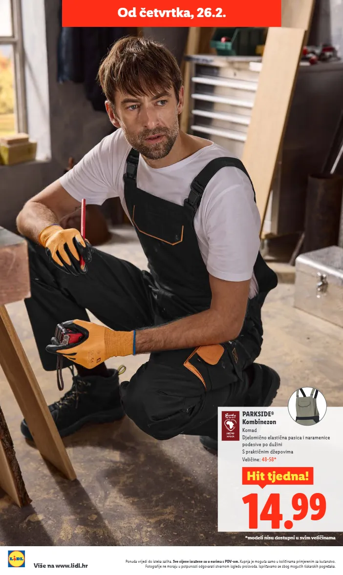 Ponuda vrijedi do isteka zaliha. Sve cijene izražene su u eurima s PDV-om. Kupnja je moguća samo u količinama primjerenim za kućanstvo. Fotografije ne moraju u potpunosti odgovarati stvarnom izgledu proizvoda. Ispričavamo se zbog mogućih tiskarskih pogrešaka. Više na www.lidl.hr *modeli nisu dostupni u svim veličinama Od četvrtka, 26.2. 14.99 H it tjedna ! PARKSIDE® Kombinezon Komad Djelomično elastična pasica i naramenice podesive po dužini S praktičnim džepovima Veličine: 48-58*