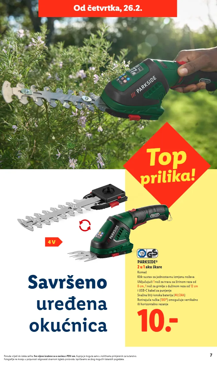 7 ponuda vrijedi do isteka zaliha. sve cijene izražene su u eurima s pdv-om. kupnja je moguća samo u količinama primjerenim za kućanstvo. fotografije ne moraju u potpunosti odgovarati stvarnom izgledu proizvoda. ispričavamo se zbog mogućih tiskarskih pogrešaka. od četvrtka, 26.2. top prilika ! parkside® 2 u 1 aku škare komad klik-sustav za jednostavnu izmjenu noževa uključujući 1 nož za travu sa širinom reza od 8 cm , 1 nož za grmlje s dužinom reza od 12 cm i usb-c kabel za punjenje snažna litij-ionska baterija ( 4v/2ah ) rotirajuća ručka ( 180° ) omogućuje vertikalno ili horizontalno rezanje 10 .- 4 v savršeno uređena okućnica