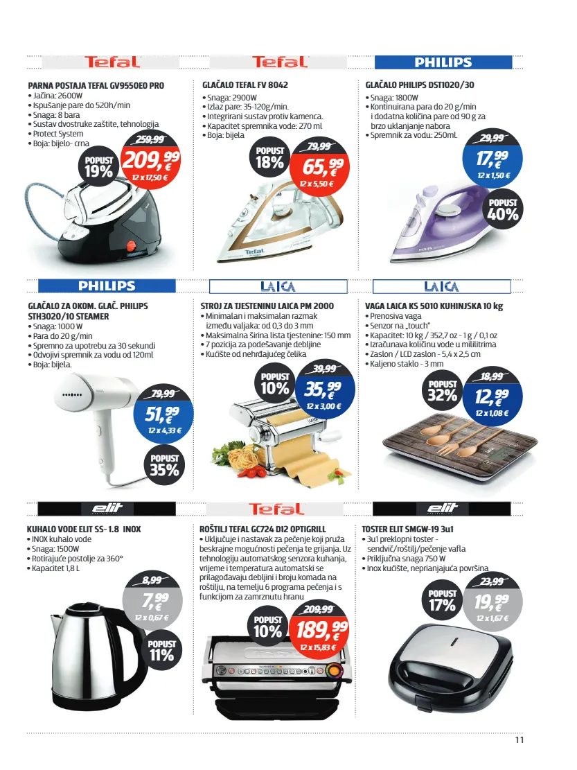 11 259,99 209,⁹⁹ € 12 x 17,50 € popust 19% parna postaja tefal gv9550eo pro • jačina: 2600w • ispušanje pare do 520h/min • snaga: 8 bara • sustav dvostruke zaštite, tehnologija • protect system • boja: bijelo- crna popust 18% glačalo tefal fv 8042 • snaga: 2900w • izlaz pare: 35-120g/min. • integrirani sustav protiv kamenca. • kapacitet spremnika vode: 270 ml • boja: bijela 79,99 65,⁹⁹ € 12 x 5,50 € glačalo philips dst1020/30 • snaga: 1800w • kontinuirana para do 20 g/min i dodatna količina pare od 90 g za brzo uklanjanje nabora • spremnik za vodu: 250ml. glačalo za okom. glač. philips sth3020/10 steamer • snaga: 1000 w • para do 20 g/min • spremno za upotrebu za 30 sekundi • odvojivi spremnik za vodu od 120ml • boja: bijela. 8,99 € 12 x 0,67 € 7,⁹⁹ popust 11% stroj za tjesteninu laica pm 2000 • minimalan i maksimalan razmak između valjaka: od 0,3 do 3 mm • maksimalna širina lista tjestenine: 150 mm • 7 pozicija za podešavanje debljine • kućište od nehrđajućeg čelika 39,99 € 12 x 3,00 € 35,⁹⁹ popust 10% vaga laica ks 5010 kuhinjska 10 kg • prenosiva vaga • senzor na „touch“ • kapacitet: 10 kg / 352,7 oz - 1 g / 0,1 oz • izračunava količinu vode u mililitrima • zaslon / lcd zaslon - 5,4 x 2,5 cm • kaljeno staklo - 3 mm 18,99 € 12 x 1,08 € 12,⁹⁹ popust 32% kuhalo vode elit ss- 1.8 inox • inox kuhalo vode • snaga: 1500w • rotirajuće postolje za 360° • kapacitet 1,8 l roštilj tefal gc724 d12 optigrill • uključuje i nastavak za pečenje koji pruža beskrajne mogućnosti pečenja te grijanja. uz tehnologiju automatskog senzora kuhanja, vrijeme i temperatura automatski se prilagođavaju debljini i broju komada na roštilju, na temelju 6 programa pečenja i s funkcijom za zamrznutu hranu 209,99 189,⁹⁹ € 12 x 15,83 € popust 10% toster elit smgw-19 3u1 • 3u1 preklopni toster - sendvič/roštilj/pečenje vafla • priključna snaga 750 w • inox kućište, neprianjajuća površina 23,99 € 12 x 1,67 € 19,⁹⁹ popust 17% 29,99 € 12 x 1,50 € 17,⁹⁹ popust 40% 79,99 € 12 x 4,33 € 51,⁹⁹ popust 35%