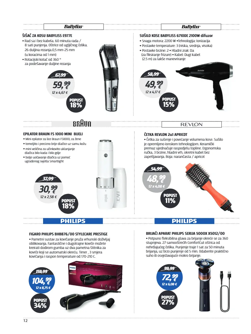 12 67,99 59,⁹⁹ € 12 x 4,67 € POPUST 18% ŠIŠAČ ZA KOSU BABYLISS E977E • Rad sa i bez kabela. 60 minuta rada / 8 sati punjenja. Oštrice od ugljičnog čelika. 26 duljina rezanja.0,5 mm-25 mm (u koracima od 1 mm) • Rotacijski kotač od 360 ° za podešavanje duljine rezanja 58,99 49,⁹⁹ € 12 x 4,17 € POPUST 15% SUŠILO KOSE BABYLISS 6710DE 2100W difuzor • • Snaga motora: 2200 W Tehnologija: Ionizacija • Postavke temperature: 3 (niska, srednja, visoka) • • Postavke brzine: 2 Hladni zrak: Da (za fiksiranje frizure) Kabel: Dugi kabel • (2.5 m) za lakše manevriranje EPILATOR BRAUN FS 1000 MINI BIJELI • Mini epilator za lice Braun FS1000, za žene • temeljito i precizno brije dlačice uz samu kožu • mini veličina za učinkovito uklanjanje dlačica bilo kada i bilo gdje • bolje uočavanje dlačica uz pomoć ugrađenog svjetla Smartlight 37,99 30,⁹⁹ € 12 x 2,58 € POPUST 18% ČETKA REVLON 2u1 APRICOT • Četka za sušenje i povećanje volumena kose. Sušilo je opremljeno ionskom tehnologijom. Keramički premaz ujednačuje raspodjelu topline. Ergonomska ručka, 3 brzine, hladni vrh, okretni kabel bez zapetljavanja. Boja: narančasta / apricot 54,99 48,⁹⁹ € 12 x 4,08 € POPUST 11% 159,99 104,⁹⁹ € 12 x 8,75 € POPUST 34% FIGARO PHILIPS BHB876/00 STYLECARE PRESTIGE • Pametni sustav za kovrčanje pruža vrhunski doživljaj oblikovanja. Fantastične i dugotrajne kovrče možete kreirati dodirom gumba uz dva pametna štitnika za kovrče koji se automatski okreću. Timer , 3 smjera kovrčanja i raspon temperature od 170-210 C. 99,99 72,⁹⁹ € 12 x 6,08 € POPUST 27% BRIJAČI APARAT PHILIPS SERIJA 5000X X5012/00 • Potpuno fleksibilna glava za brijanje okreće se za 360 stupnjeva. 27 samooštrećih ComfortCut oštrica od nehrđajućeg čelika. Punjenje traje 1 sat za 50 minuta brijanja, uz brzo punjenje od 5 min. Odaberite praktično suho ili osvježavajuće mokro brijanje.