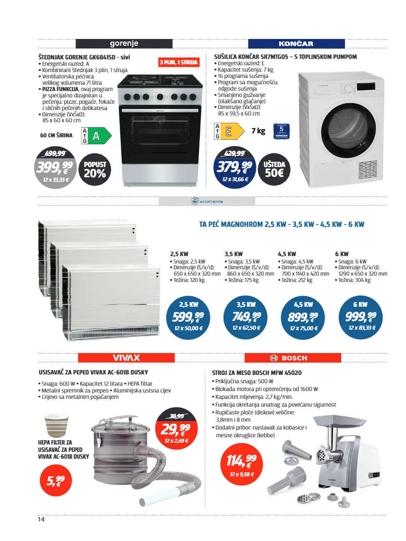 14 749,⁹⁹ € 12 x 62,50 € 599,⁹⁹ € 12 x 50,00 € 2,5 kw 3,5 kw 999,⁹⁹ € 12 x 83,33 € 899,⁹⁹ € 12 x 75,00 € 4,5 kw 6 kw 2,5 kw • snaga: 2,5 kw dimenzije (š/v/d): • 650 x 650 x 320 mm težina: 120 kg • ta peć magnohrom 2,5 kw - 3,5 kw - 4,5 kw - 6 kw • snaga: 3,5 kw dimenzije (š/v/d): • 860 x 650 x 320 mm težina: 175 kg • • snaga: 4,5 kw dimenzije (š/v/d): • 700 x 1140 x 420 mm težina: 212 kg • • snaga: 6 kw dimenzije (š/v/d): • 1290 x 650 x 320 mm težina: 304 kg • 3,5 kw 4,5 kw 6 kw stroj za meso bosch mfw 45020 • priključna snaga: 500 w blokada motora pri opterećenju od 1600 w • kapacitet mljevenja: 2,7 kg/min. • funkcija okretanja unatrag za povećanu sigurnost • rupičaste ploče (diskovi) veličine: • 3,8mm i 8 mm dodatni pribor: nastavak za kobasice i • mesne okruglice (kebbe) 114,⁹⁹ € 12 x 9,58 € usisavač za pepeo vivax ac-601b dusky • • • snaga: 600 w kapacitet 12 litara hepa filtar • • metalni spremnik za prepeo aluminijska usisna cijev • crijevo sa metalnim pojačanjem 5,⁹⁹ € hepa filter za usisavač za pepeo vivax ac-601b dusky 39,99 29,⁹⁹ € 12 x 2,49 € štednjak gorenje gk6b41sd - sivi • energetski razred: a • kombinirani štednjak 3 plin, 1 struja • ventilatorska pećnica velikog volumena 71 litra • pizza funkcija , ovaj program je specijalno dizajniran u pečenju: pizze, pogače, fokaće i sličnih pečenih delikatesa • dimenzije (vxšxd): 85 x 60 x 60 cm popust 20% 3 plin, 1 struja € 499,99 399,⁹⁹ € 12 x 33,33 € 60 cm širina sušilica končar sr7mtg05 – s toplinskom pumpom • energetski razred: e • kapacitet sušenja: 7 kg • 16 programa sušenja • program sa mogućnošću odgode sušenja • smanjeno gužvanje (olakšano glačanje) • dimenzije (vxšxd): 85 x 59,5 x 60 cm ušteda 50€ 429,99 379,⁹⁹ € 12 x 31,66 € 7 kg