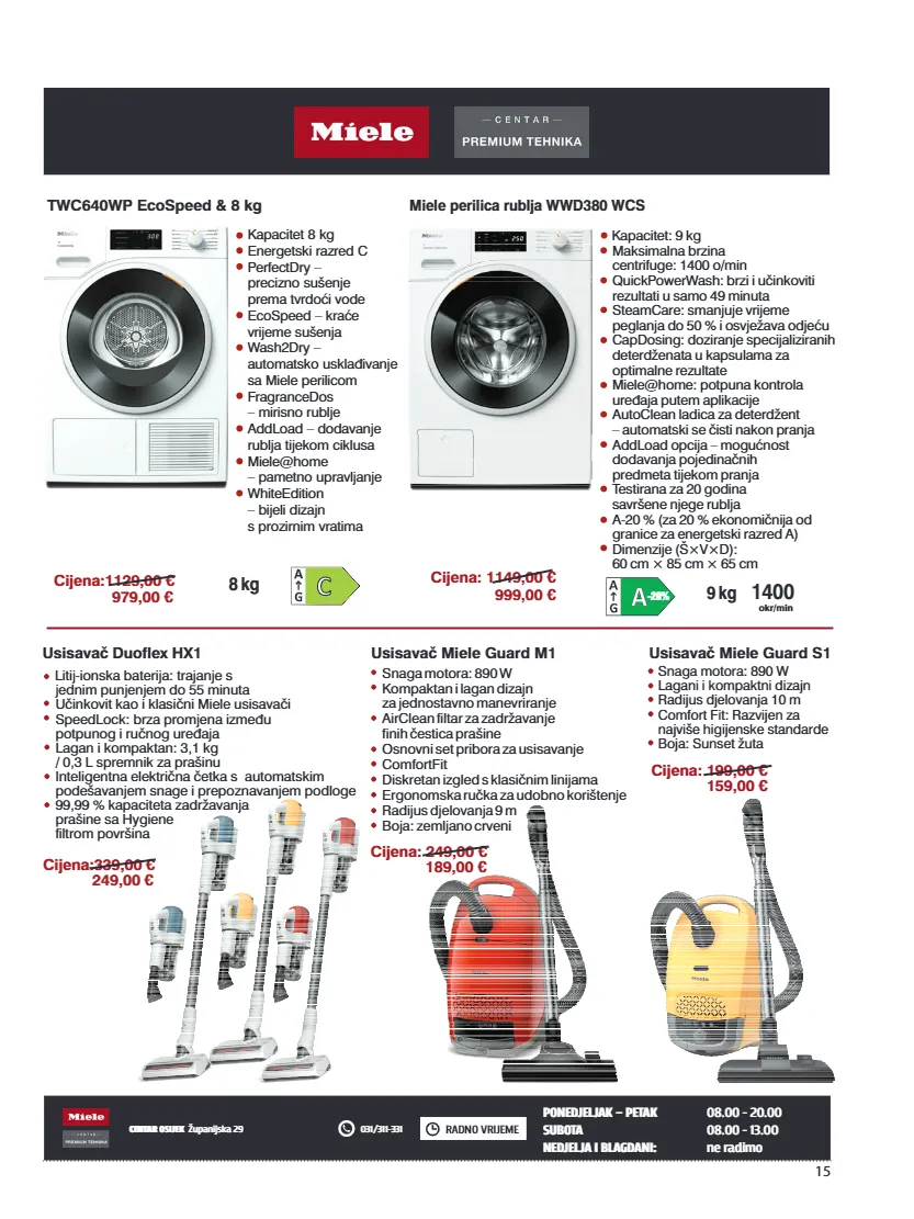 15 radno vrijeme centar osijek županijska 29 031/311-331 litij-ionska baterija: trajanje s jednim punjenjem do 55 minuta učinkovit kao i klasični miele usisavači speedlock: brza promjena između potpunog i ručnog uređaja lagan i kompaktan: 3,1 kg / 0,3 l spremnik za prašinu inteligentna električna četka s automatskim podešavanjem snage i prepoznavanjem podloge 99,99 % kapaciteta zadržavanja prašine sa hygiene filtrom površina usisavač duoflex hx1 cijena:339,00 € 249,00 € kapacitet 8 kg energetski razred c perfectdry – precizno sušenje prema tvrdoći vode ecospeed – kraće vrijeme sušenja wash2dry – automatsko usklađivanje sa miele perilicom fragrancedos – mirisno rublje addload – dodavanje rublja tijekom ciklusa miele@home – pametno upravljanje whiteedition – bijeli dizajn s prozirnim vratima twc640wp ecospeed & 8 kg 8 kg 08.00 - 20.00 ponedjeljak – petak - subota 08.00 13.00 nedjelja blagdani i : ne radimo -10% usisavač miele guard s1 cijena: 199,00 € 159,00 € snaga motora: 890 w lagani i kompaktni dizajn radijus djelovanja 10 m comfort fit: razvijen za najviše higijenske standarde boja: sunset žuta 9 kg 1400 okr/min € miele perilica rublja wwd380 wcs kapacitet: 9 kg maksimalna brzina centrifuge: 1400 o/min quickpowerwash: brzi i učinkoviti rezultati u samo 49 minuta steamcare: smanjuje vrijeme peglanja do 50 % i osvježava odjeću capdosing: doziranje specijaliziranih deterdženata u kapsulama za optimalne rezultate miele@home: potpuna kontrola uređaja putem aplikacije autoclean ladica za deterdžent – automatski se čisti nakon pranja addload opcija – mogućnost dodavanja pojedinačnih predmeta tijekom pranja testirana za 20 godina savršene njege rublja a-20 % (za 20 % ekonomičnija od granice za energetski razred a) dimenzije (š×v×d): 60 cm × 85 cm × 65 cm cijena: 1149,00 € 999,00 € -20% usisavač miele guard m1 snaga motora: 890 w kompaktan i lagan dizajn za jednostavno manevriranje airclean filtar za zadržavanje finih čestica prašine osnovni set pribora za usisavanje comfortfit diskretan izgled s klasičnim linijama ergonomska ručka za udobno korištenje radijus djelovanja 9 m boja: zemljano crveni cijena: 249,00 € 189,00 € cijena:1129,00 € 979,00 €