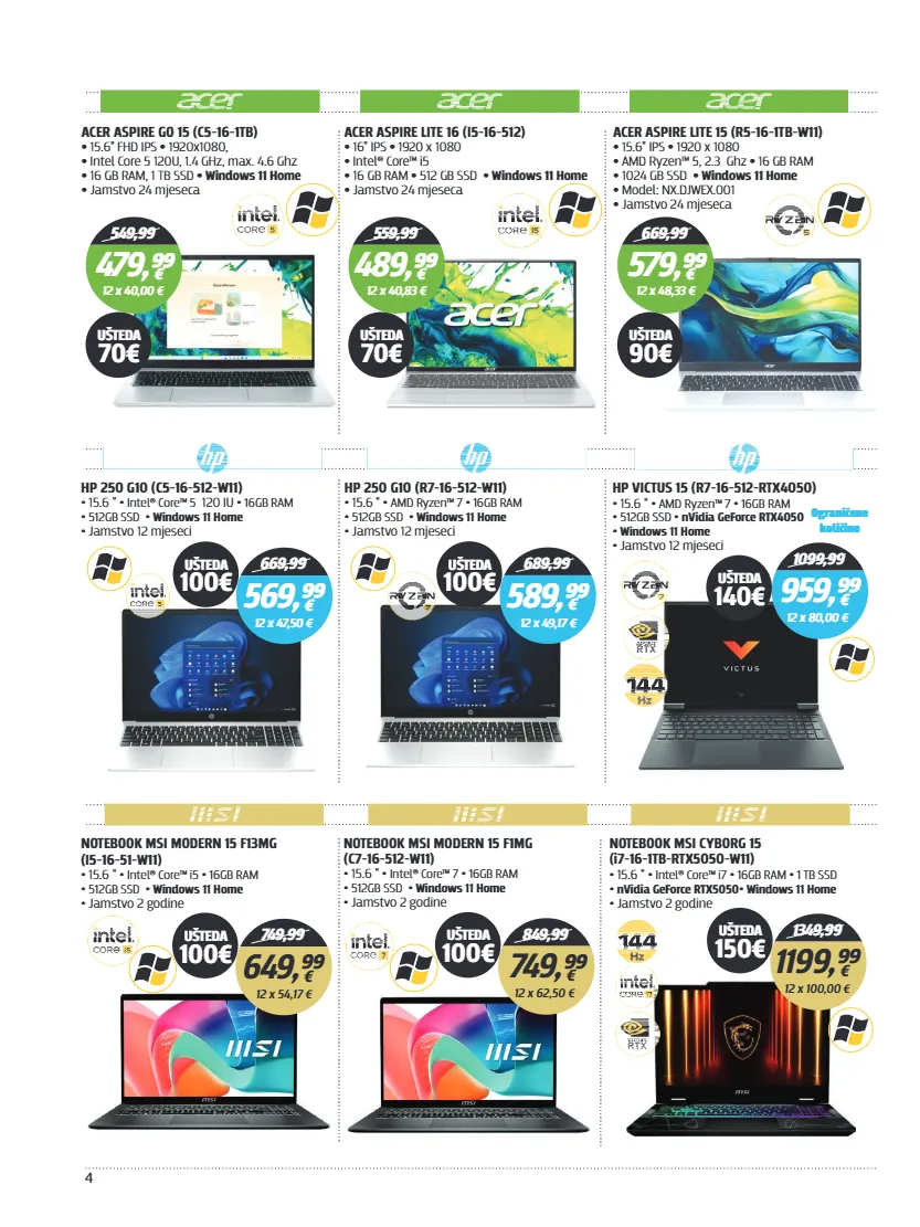ACER ASPIRE LITE 15 (R5-16-1TB-W11) 15.6" IPS 1920 x 1080 • • AMD Ryzen™ 5, 2.3 Ghz 16 GB RAM • • 1024 GB SSD Windows 11 Home • • Model: NX.DJWEX.001 • Jamstvo 24 mjeseca • 669,99 579,⁹⁹ € 12 x 48,33 € UŠTEDA 90€ ACER ASPIRE GO 15 (C5-16-1TB) 15.6" FHD IPS 1920x1080, • • Intel Core 5 120U, 1.4 GHz, max. 4.6 Ghz • 16 GB RAM, 1 TB SSD Windows 11 Home • • Jamstvo 24 mjeseca • ACER ASPIRE LITE 16 (I5-16-512) 16" IPS 1920 x 1080 • • Intel® Core™ i5 • 16 GB RAM 512 GB SSD Windows 11 Home • • • Jamstvo 24 mjeseca • 549,99 559,99 479,⁹⁹ 489,⁹⁹ € € 12 x 40,00 € 12 x 40,83 € UŠTEDA 70€ UŠTEDA 70€ HP 250 G10 (C5-16-512-W11) Intel® Core™ 5 16GB RAM 15.6 " 120 IU • • • 512GB SSD Windows 11 Home • • Jamstvo 12 i • mjesec NOTEBOOK MSI MODERN 15 F13MG (I5-16-51-W11) Intel® Core™ i5 16GB RAM 15.6 " • • • 512GB SSD Windows 11 Home • • Jamstvo 2 godine • NOTEBOOK MSI MODERN 15 F1MG (C7-16-512-W11) Intel® Core™ 7 16GB RAM 15.6 " • • • 512GB SSD Windows 11 Home • • Jamstvo 2 godine • NOTEBOOK MSI CYBORG 15 (i7-16-1TB-RTX5050-W11) Intel® Core™ i7 16GB RAM 1 TB SSD 15.6 " • • • • nVidia GeForce RTX5050 Windows 11 Home • • Jamstvo 2 godine • HP 250 G10 (R7-16-512-W11) AMD Ryzen™ 7 16GB RAM 15.6 " • • • 512GB SSD Windows 11 Home • • Jamstvo 12 i • mjesec HP VICTUS 15 (R7-16-512-RTX4050) AMD Ryzen™ 7 16GB RAM 15.6 " • • • 512GB SSD nVidia GeForce RTX4050 • • Windows 11 Home • Jamstvo 12 i • mjesec 669,99 749,99 849,99 689,99 1099,99 569,⁹⁹ 649,⁹⁹ 749,⁹⁹ 589,⁹⁹ 959,⁹⁹ € € € € € 12 x 47,50 € 12 x 54,17 € 12 x 62,50 € 12 x 49,17 € 12 x 80,00 € UŠTEDA 100€ UŠTEDA 100€ UŠTEDA 100€ UŠTEDA 100€ UŠTEDA 140€ Ograničene količine 1349,99 1199,⁹⁹ € 12 x 100,00 € UŠTEDA 150€ 4