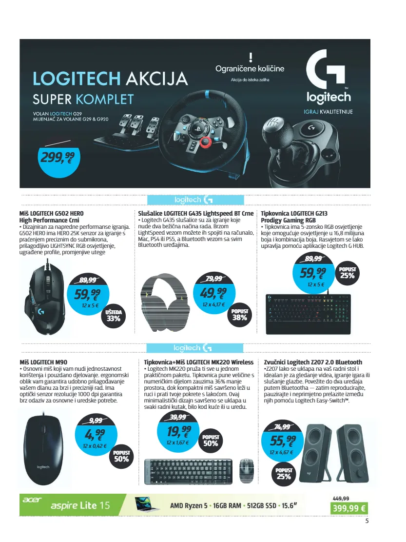 5 299,⁹⁹ € miš logitech g502 hero high performance crni dizajniran za napredne performanse igranja. • g502 hero ima hero 25k senzor za igranje s praćenjem preciznim do submikrona, prilagodljivo lightsync rgb osvjetljenje, ugrađene profile, promjenjive utege 89,99 59,⁹⁹ € 12 x 5 € ušteda 33% slušalice logitech g435 lightspeed bt crne logitech g435 slušalice su za igranje koje • nude dva bežična načina rada. brzom lightspeed vezom možete ih spojiti na računalo, mac, ps4 ili ps5, a bluetooth vezom sa svim bluetooth uređajima. 79,99 49,⁹⁹ € 12 x 4,17 € popust 38% tipkovnica logitech g213 prodigy gaming rgb tipkovnica ima 5-zonsko rgb osvjetljenje • koje omogućuje osvjetljenje u 16,8 milijuna boja i kombinacija boja. rasvjetom se lako upravlja pomoću aplikacije logitech g hub. 89,99 59,⁹⁹ € 12 x 5 € popust 25% miš logitech m90 osnovni miš koji vam nudi jednostavnost • korištenja i pouzdano djelovanje. ergonomski oblik vam garantira udobno prilagođavanje vašem dlanu za brzi i precizniji rad. ima optički senzor rezolucije 1000 dpi garantira brz odaziv za osnovne i uredske potrebe. 9,99 4,⁹⁹ € 12 x 0,42 € popust 50% tipkovnica+miš logitech mk220 wireless logitech mk220 pruža ti sve u jednom • praktičnom paketu. tipkovnica pune veličine s numeričkim dijelom zauzima 36% manje prostora, dok kompaktni miš savršeno leži u ruci i prati tvoje pokrete s lakoćom. ovaj minimalistički dizajn savršeno se uklapa u svaki radni kutak, bilo kod kuće ili u uredu. 39,99 19,⁹⁹ € 12 x 1,67 € popust 50% zvučnici logitech z207 2.0 bluetooth z207 lako se uklapa na vaš radni stol i • idealan je za gledanje videa, igranje igara ili slušanje glazbe. povežite do dva uređaja putem bluetootha — zatim reproducirajte, pauzirajte i neprimjetno prelazite između njih pomoću logitech easy-switch™. 74,99 55,⁹⁹ € 12 x 4,67 € popust 25%