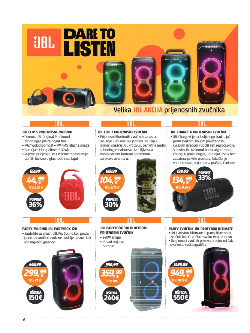 6 jbl clip 5 prijenosni zvučnik • pomoću jbl original pro sound tehnologije pruža bogat bas ip67 vodootpornost 7w rms izlazna snaga • • baterija: li-ion polimer 5.32wh • vrijeme punjenja: 3h vrijeme reprodukcije: • • do 12h (ovisno o glasnoći i sadržaju) 449,99 299,⁹⁹ € 12 x 25 € party zvučnik jbl partybox ultimate • jbl partybox ultimate je party bluetooth zvučnik koji će začiniti svaku tvoju zabavu. ovaj moćni zvučnik pokriva prostor od čak • dva košarkaška igrališta. 1499,99 949,⁹⁹ € 12 x 79,19 € ušteda 550€ ušteda 150€ jbl partybox 310 bluetooth prijenosni zvučnik • 240w snage 18 sati trajanja • baterije 599,99 € 12 x 30€ 359,⁹⁹ ušteda 240€ 69,99 44,⁹⁹ € 12 x 3,75 € popust 36% jbl flip 7 prijenosni zvučnik • prijenosni bluetooth zvučnici danas su svugdje – ali nisu svi jednaki. jbl flip 7 donosi snažniji jbl pro zvuk, pametne audio tehnologije i vrhunsku izdržljivost u kompaktnom formatu spremnom za svaku avanturu. 149,99 104,⁹⁹ € 12 x 8,75 € popust 30% party zvučnik jbl partybox 120 • zaplešite uz moćni jbl pro sound koji pruža jasne, dinamične zvukove i dublje basove čak i pri najvećoj glasnoći jbl charge 6 prijenosni zvučnik • jbl charge 6 je tu, bolji nego ikad, s još jačim zvukom, boljom povezanošću, čvršćom izradom i do 28 sati reprodukcije. s novim jbl ai sound boost algoritmom, charge 6 pruža bogat, uranjajući zvuk bez zauzimanja više prostora. također je vodootporan, otporan na prašinu i udarce. 199,99 134,⁹⁹ € 12 x 11,25 € popust 33%