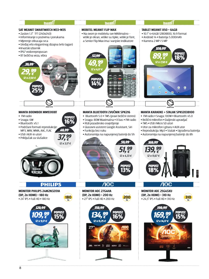8 sat meanit smartwatch m33•m35 • zaslon 1.3" tft (240x240) informiranje o pozivima i porukama • mjerenje otkucaja srca • uređaj vrlo elegantnog dizajna (vrlo lagan) • hrvatski izbornik • ip67 vodonepropusan • bt bežična veza, vibra • 39,99 29,⁹⁹ € 12 x 2,50 € popust 25% 57,99 49,⁹⁹ € 12 x 4,17 € popust 14% 109,99 89,⁹⁹ € 12 x 7,50 € popust 18% mobitel meanit flip max • na ovom je mobitelu sve maximalno – veliki je ekran, velike su tipke, veliki je font, a senior flip max ima i vanjske indikatore tablet meanit x50 • 64gb • 10.1“ 4+64gb 1280x800, 16:9 format android 14 baterija 5.000mah • • kamera 2 mp i 5 mp • manta boombox mm9310bt • fm radio snaga: 6w • bluetooth: v5.1 • podržani formati reprodukcije: • mp3, wav, wma, aac, flac usb i aux-in utori • priključak za slušalice • 49,99 37,⁹⁹ € 12 x 3,17 € popust 16% manta bluetooth zvučnik spk216 • • bluetooth 5.0 tws (pravi bežični stereo) snaga: 80w maximalna x bas fm radio • • • rgb pozadinsko osvjetljenje • glasovni asistent google assistant, siri • funkcija bez ruku • autonomija na napunjenoj bateriji do 5h • 59,99 51,⁹⁹ € 12 x 4,33 € popust 13% 169,99 139,⁹⁹ € 12 x 11,67 € popust 18% manta karaoke + stalak spk1203b100 • • • fm radio snaga: 100w bluetooth: v5.0 bežični mikrofon daljinski upravljač • • tws usb i micro sd utori • • utor za mikrofon i gitaru aux utor • • reprodukcija: mp3 stalak ugrađena baterija • • • autonomija na napunjenoj bateriji: do 8h • monitor philips 24m2n3201a (dp, 2x hdmi) • 180 hz • • • 24" ips full hd 180 hz 129,99 109,⁹⁹ € 12 x 9,17 € popust 15% 180 hz monitor aoc 27g4ha (dp, 2x hdmi) • 200 hz • • • 27" ips full hd 200 hz 200 hz 159,99 134,⁹⁹ € 12 x 11,25 € popust 16% 199,99 169,⁹⁹ € 12 x 14,17 € popust 15% monitor aoc 25g4sxu (dp, 2x hdmi) • 310 hz • • • 24,5" ips full hd 310 hz 310 hz