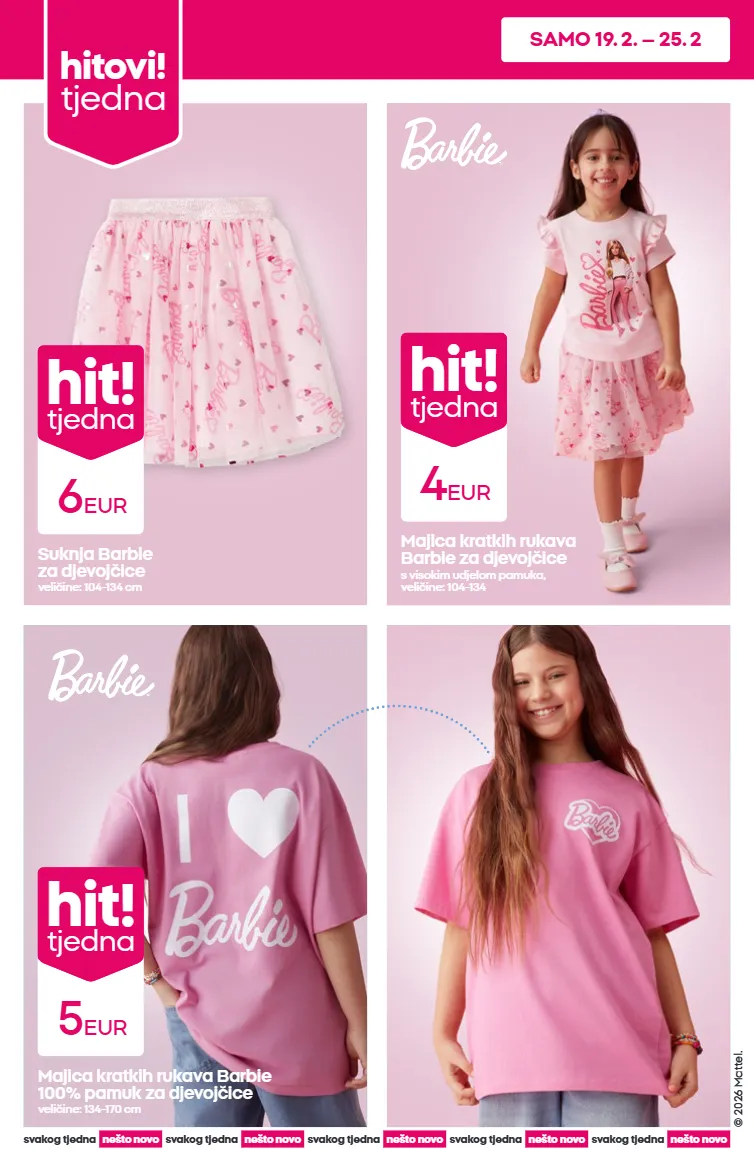 nešto novo svakog tjedna nešto novo svakog tjedna nešto novo svakog tjedna nešto novo svakog tjedna nešto novo svakog tjedna samo 19. 2. – 25. 2 hitovi! tjedna majica kratkih rukava barbie za djevojčice s visokim udjelom pamuka, veličine: 104-134 suknja barbie za djevojčice veličine: 104-134 cm majica kratkih rukava barbie 100% pamuk za djevojčice veličine: 134-170 cm 4 eur hit! tjedna 6 eur hit! tjedna 5 eur hit! tjedna © 2026 mattel.