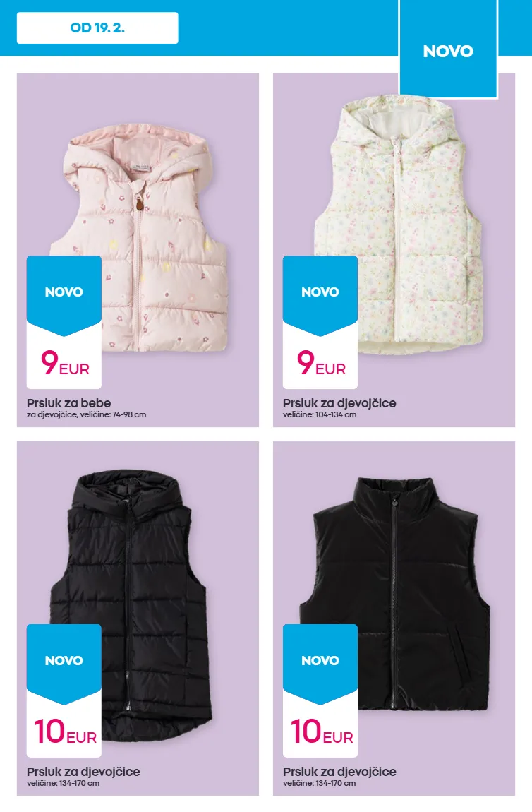 NOVO OD 19. 2. Prsluk za djevojčice veličine: 104-134 cm Prsluk za djevojčice veličine: 134-170 cm Prsluk za bebe za djevojčice, veličine: 74-98 cm Prsluk za djevojčice veličine: 134-170 cm 9 EUR NOVO 10 EUR NOVO 9 EUR NOVO 10 EUR NOVO