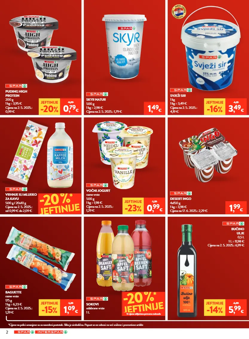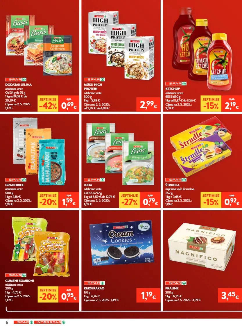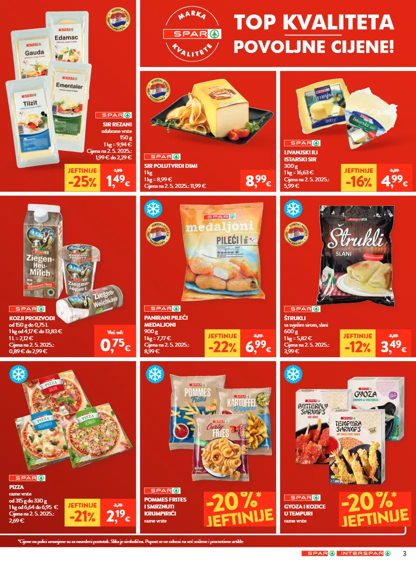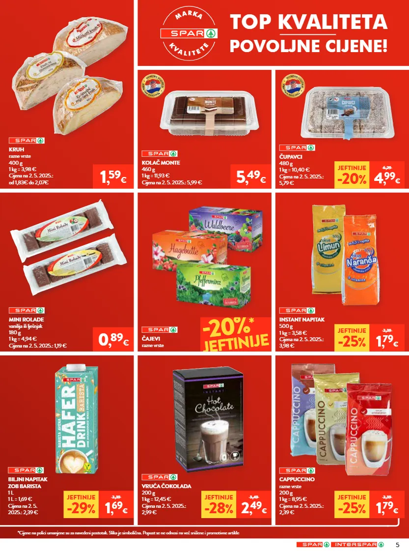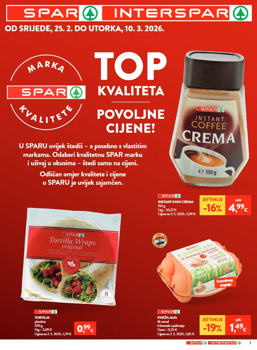 top kvaliteta povoljne cijene! jeftinije -16 % 5,99 4 , 99 € u sparu uvijek štediš – a posebno s vlastitim markama. odaberi kvalitetnu spar marku i uživaj u okusima – štedi samo na cijeni. odličan omjer kvalitete i cijene u sparu je uvijek zajamčen. jeftinije -19 % 1,85 1 , 49 € svježa jaja m razred 6 komada u pakiranju 1 kom = 0,25 € cijena na 2. 5. 2025.: 1,85 € instant kava crema 150 g 1 kg = 33,27 € cijena na 2. 5. 2025.: 5,99 € iz podnog uzgoja od srijede, 25. 2. do utorka, 10. 3. 2026. 1 tortilja pšenična 320 g 1 kg = 3,09 € cijena na 2. 5. 2025.: 1,79 € 0 , 99 €