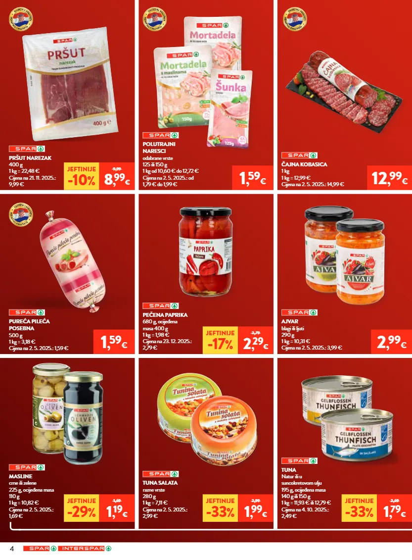 jeftinije -10 % 9,99 8 , 99 € jeftinije -17 % 2,79 2 , 29 € jeftinije -33 % 2,99 1 , 99 € jeftinije -33 % 2,69 1 , 79 € jeftinije -29 % 1,69 1 , 19 € polutrajni naresci odabrane vrste 125 ili 150 g 1 kg od 10,60 € do 12,72 € cijena na 2. 5. 2025.: od 1,79 € do 1,99 € ajvar blagi ili ljuti 290 g 1 kg = 10,31 € cijena na 2. 5. 2025.: 3,99 € pureća pileća posebna 500 g 1 kg = 3,18 € cijena na 2. 5. 2025.: 1,59 € pršut narezak 400 g 1 kg = 22,48 € cijena na 21. 11. 2025.: 9,99 € tuna salata razne vrste 280 g 1 kg = 7,11 € cijena na 2. 5. 2025.: 2,99 € pečena paprika 680 g, ocijeđena masa 400 g 1 kg = 1,98 € cijena na 23. 12. 2025.: 2,79 € tuna natur ili u suncokretovom ulju 195 g, ocijeđena masa 140 g ili 150 g 1 kg = 11,93 € ili 12,79 € cijena na 4. 10. 2025.: 2,49 € čajna kobasica 1 kg 1 kg = 12,99 € cijena na 2. 5. 2025.: 14,99 € masline crne ili zelene 225 g, ocijeđena masa 110 g 1 kg = 10,82 € cijena na 2. 5. 2025.: 1,69 € 12 , 99 € 1 , 59 € 1 , 59 € 2 , 99 € 4