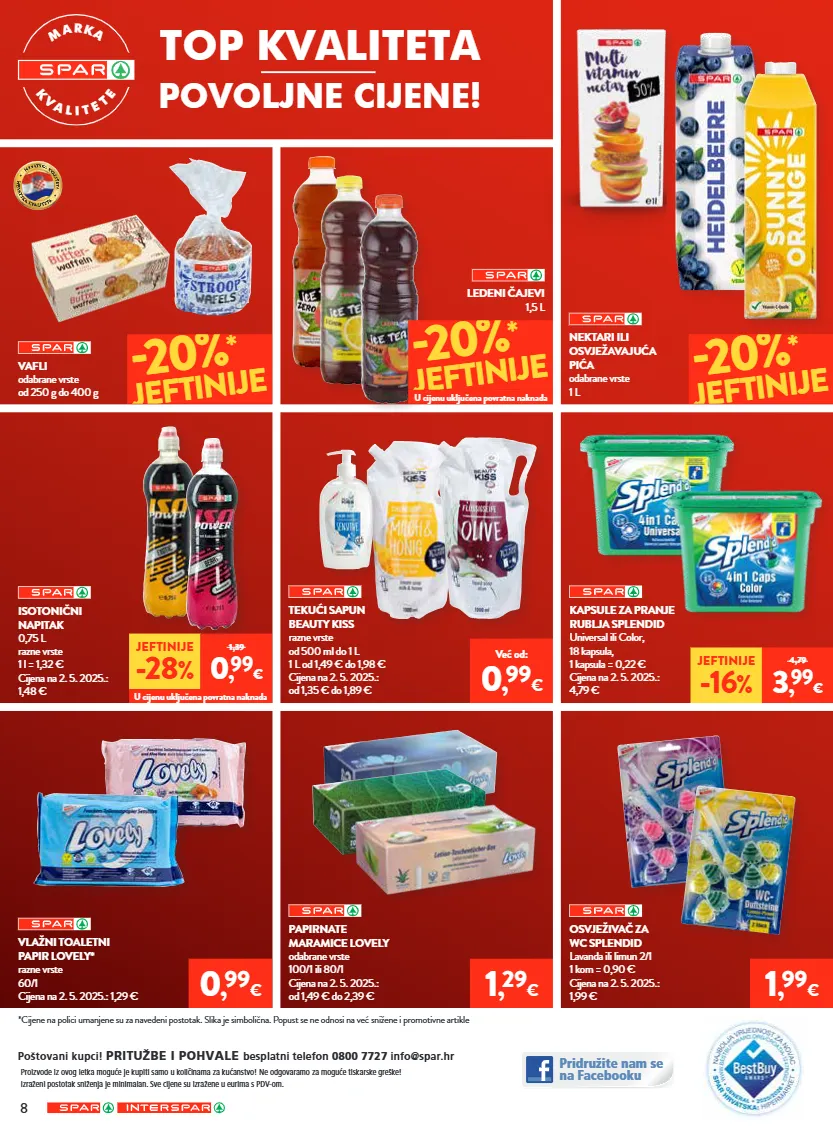 pridružite nam se na facebooku poπtovani kupci! prituæbe i pohvale besplatni telefon 0800 7727 info@spar.hr proizvode iz ovog letka moguće je kupiti samo u količinama za kućanstvo! ne odgovaramo za moguće tiskarske greške! izraženi postotak sniženja je minimalan. sve cijene su izražene u eurima s pdv-om. jeftinije -16 % 4,79 3 , 99 € jeftinije -28 % 1,39 0 , 99 € ledeni čajevi 1,5 l nektari ili osvježavajuća pića odabrane vrste 1 l kapsule za pranje rublja splendid universal ili color, 18 kapsula, 1 kapsula = 0,22 € cijena na 2. 5. 2025.: 4,79 € osvježivač za wc splendid lavanda ili limun 2/1 1 kom = 0,90 € cijena na 2. 5. 2025.: 1,99 € isotonični napitak 0,75 l razne vrste 1 l = 1,32 € cijena na 2. 5. 2025.: 1,48 € vafli odabrane vrste od 250 g do 400 g vlažni toaletni papir lovely* razne vrste 60/1 cijena na 2. 5. 2025.: 1,29 € tekući sapun beauty kiss razne vrste od 500 ml do 1 l 1 l od 1,49 € do 1,98 € cijena na 2. 5. 2025.: od 1,35 € do 1,89 € papirnate maramice lovely odabrane vrste 100/1 ili 80/1 cijena na 2. 5. 2025.: od 1,49 € do 2,39 € već od: 0 , 99 € top kvaliteta povoljne cijene! m a r k a k v a l i t e t e u cijenu uključena povratna naknada 0 , 99 € 1 , 29 € 1 , 99 € -20% * jeftinije -20% * jeftinije u cijenu uključena povratna naknada -20% * jeftinije *cijene na polici umanjene su za navedeni postotak. slika je simbolična. popust se ne odnosi na već snižene i promotivne artikle 8
