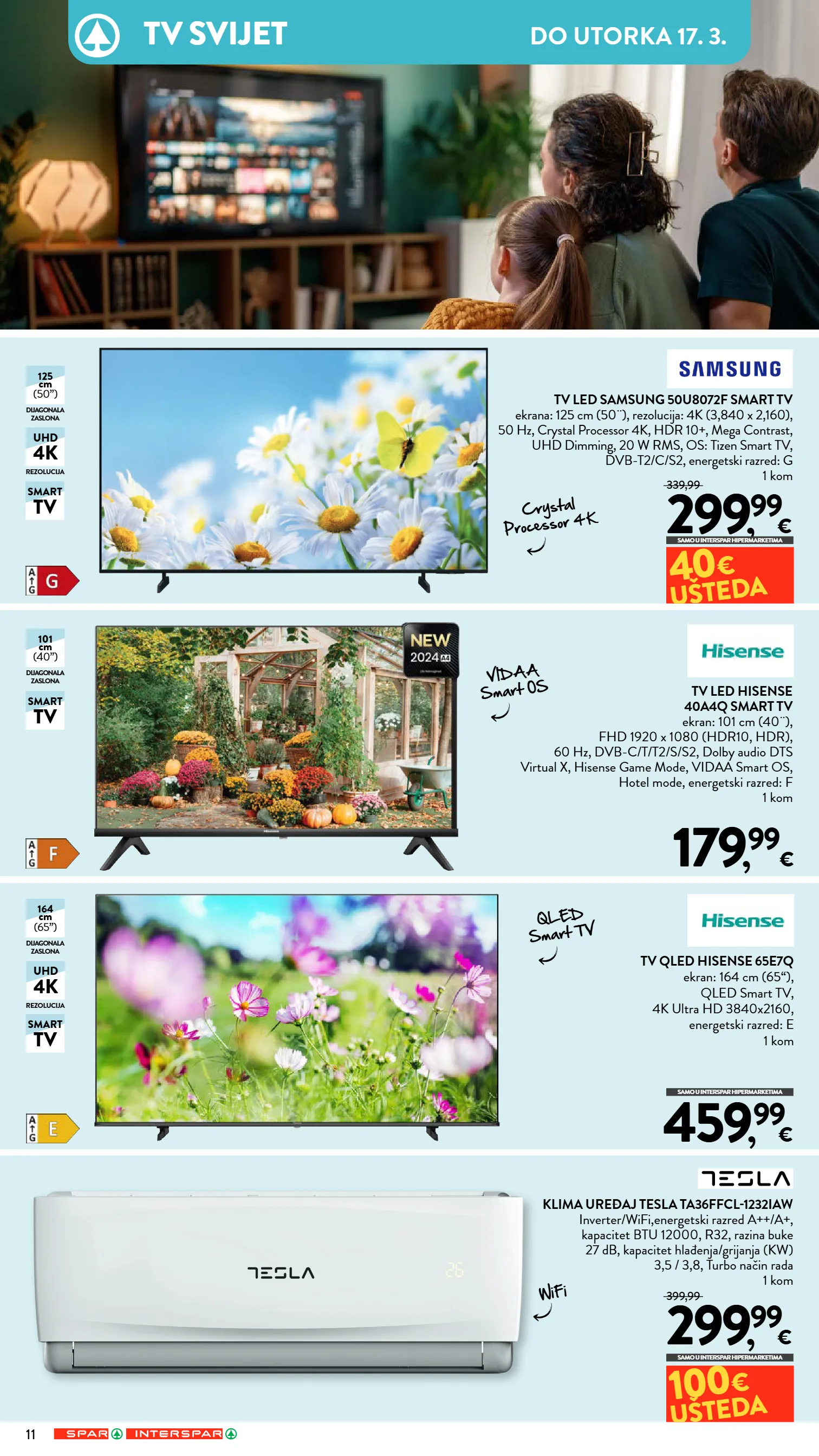299 , 99 € 399,99 299 , 99 € 339,99 100 € ušteda 40 € ušteda 11 tv svijet do utorka 17. 3. tv led samsung 50u8072f smart tv ekrana: 125 cm (50¨), rezolucija: 4k (3,840 x 2,160), 50 hz, crystal processor 4k, hdr 10+, mega contrast, uhd dimming, 20 w rms, os: tizen smart tv, dvb-t2/c/s2, energetski razred: g 1 kom klima uređaj tesla ta36ffcl-1232iaw inverter/wifi,energetski razred a++/a+, kapacitet btu 12000, r32, razina buke 27 db, kapacitet hlađenja/grijanja (kw) 3,5 / 3,8, turbo način rada 1 kom tv qled hisense 65e7q ekran: 164 cm (65“), qled smart tv, 4k ultra hd 3840x2160, energetski razred: e 1 kom 459 , 99 € tv led hisense 40a4q smart tv ekran: 101 cm (40¨), fhd 1920 x 1080 (hdr10, hdr), 60 hz, dvb-c/t/t2/s/s2, dolby audio dts virtual x, hisense game mode, vidaa smart os, hotel mode, energetski razred: f 1 kom 179 , 99 € 101 cm (40”) dijagonala zaslona 125 cm (50”) dijagonala zaslona rezolucija uhd 4k smart tv smart tv qled smart tv vidaa smart os 164 cm (65”) dijagonala zaslona rezolucija uhd 4k smart tv wifi crystal processor 4k samo u interspar hipermarketima samo u interspar hipermarketima samo u interspar hipermarketima