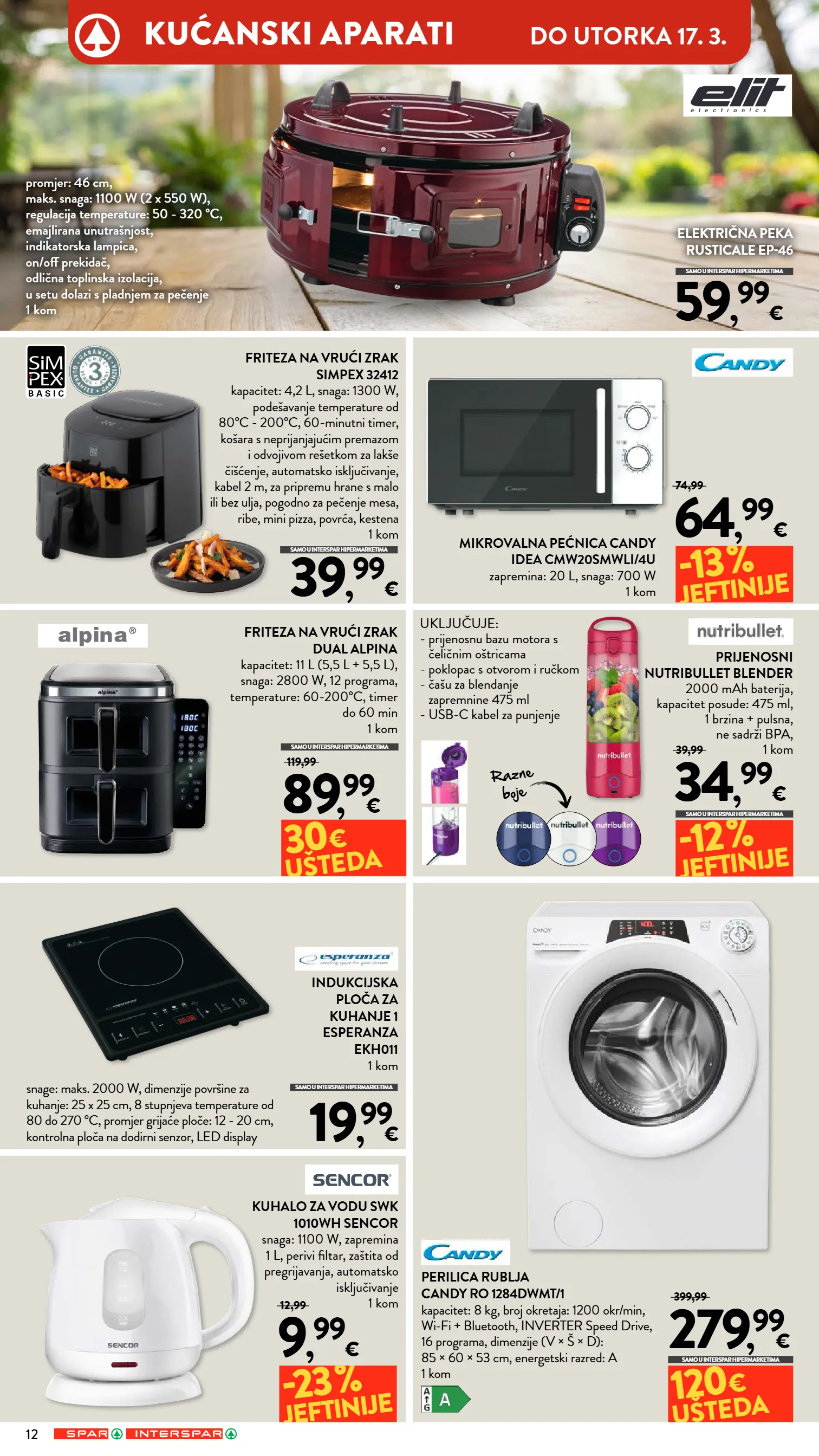 perilica rublja candy ro 1284dwmt/1 kapacitet: 8 kg, broj okretaja: 1200 okr/min, wi-fi + bluetooth, inverter speed drive, 16 programa, dimenzije (v × š × d): 85 × 60 × 53 cm, energetski razred: a 1 kom prijenosni nutribullet blender 2000 mah baterija, kapacitet posude: 475 ml, 1 brzina + pulsna, ne sadrži bpa, 1 kom uključuje: - prijenosnu bazu motora s čeličnim oštricama - poklopac s otvorom i ručkom - čašu za blendanje zapremnine 475 ml - usb-c kabel za punjenje snage: maks. 2000 w, dimenzije površine za kuhanje: 25 x 25 cm, 8 stupnjeva temperature od 80 do 270 °c, promjer grijaće ploče: 12 - 20 cm, kontrolna ploča na dodirni senzor, led display indukcijska ploča za kuhanje 1 esperanza ekh011 1 kom mikrovalna pećnica candy idea cmw20smwli/4u zapremina: 20 l, snaga: 700 w 1 kom električna peka rusticale ep-46 promjer: 46 cm, maks. snaga: 1100 w (2 x 550 w), regulacija temperature: 50 - 320 °c, emajlirana unutrašnjost, indikatorska lampica, on/off prekidač, odlična toplinska izolacija, u setu dolazi s pladnjem za pečenje 1 kom 59 , 99 € 64 , 99 € 74,99 34 , 99 € 39,99 9 , 99 € 12,99 -13 % jeftinije -12 % jeftinije -23 % jeftinije friteza na vrući zrak dual alpina kapacitet: 11 l (5,5 l + 5,5 l), snaga: 2800 w, 12 programa, temperature: 60-200°c, timer do 60 min 1 kom 19 , 99 € friteza na vrući zrak simpex 32412 kapacitet: 4,2 l, snaga: 1300 w, podešavanje temperature od 80°c - 200°c, 60-minutni timer, košara s neprijanjajućim premazom i odvojivom rešetkom za lakše čišćenje, automatsko isključivanje, kabel 2 m, za pripremu hrane s malo ili bez ulja, pogodno za pečenje mesa, ribe, mini pizza, povrća, kestena 1 kom 39 , 99 € razne boje kuhalo za vodu swk 1010wh sencor snaga: 1100 w, zapremina 1 l, perivi filtar, zaštita od pregrijavanja, automatsko isključivanje 1 kom 279 , 99 € 399,99 89 , 99 € 119,99 120 € ušteda 30 € ušteda samo u interspar hipermarketima samo u interspar hipermarketima samo u interspar hipermarketima samo u interspar hipermarketima samo u interspar hipermarketima samo u interspar hipermarketima 12 kućanski aparati do utorka 17. 3.