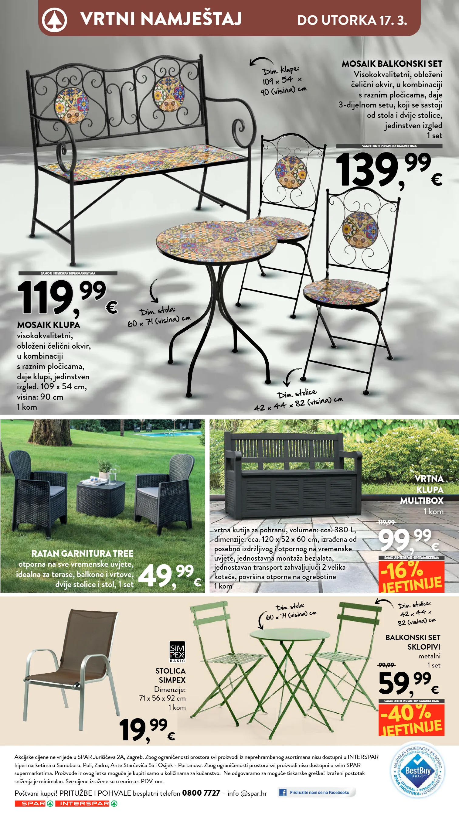 stolica simpex dimenzije: 71 x 56 x 92 cm 1 kom 19 , 99 € vrtna klupa multibox 1 kom ratan garnitura tree otporna na sve vremenske uvjete, idealna za terase, balkone i vrtove, dvije stolice i stol, 1 set 49 , 99 € balkonski set sklopivi metalni 1 set 59 , 99 € 99,99 -40 % jeftinije samo u interspar hipermarketima 99 , 99 € 119,99 -16 % jeftinije samo u interspar hipermarketima mosaik klupa visokokvalitetni, obloženi čelični okvir, u kombinaciji s raznim pločicama, daje klupi, jedinstven izgled. 109 x 54 cm, visina: 90 cm 1 kom 119 119 , , 99 99 € € samo u interspar hipermarketima mosaik balkonski set visokokvalitetni, obloženi čelični okvir, u kombinaciji s raznim pločicama, daje 3-dijelnom setu, koji se sastoji od stola i dvije stolice, jedinstven izgled 1 set 139 , 99 € samo u interspar hipermarketima dim. stola: 60 x 71 (visina) cm dim. stolice 42 x 44 x 82 (visina) cm dim. klupe: 109 x 54 x 90 (visina) cm dim. stolice: 42 x 44 x 82 (visina) cm dim. stola: 60 x 71 (visina) cm vrtna kutija za pohranu, volumen: cca. 380 l, dimenzije: cca. 120 x 52 x 60 cm, izrađena od posebno izdržljivog i otpornog na vremenske uvjete, jednostavna montaža bez alata, jednostavan transport zahvaljujući 2 velika kotača, površina otporna na ogrebotine 1 kom akcijske cijene ne vrijede u spar jurišićeva 2a, zagreb. zbog ograničenosti prostora svi proizvodi iz neprehrambenog asortimana nisu dostupni u interspar hipermarketima u samoboru, puli, zadru, ante starčevića 5a i osijek - portanova. zbog ograničenosti prostora svi proizvodi nisu dostupni u svim spar supermarketima. proizvode iz ovog letka moguće je kupiti samo u količinama za kućanstvo. ne odgovaramo za moguće tiskarske greške! izraženi postotak sniženja je minimalan. sve cijene izražene su u eurima s pdv-om. poštvani kupci! pritužbe i pohvale besplatni telefon 0800 7727 – info @spar.hr text do utorka 17. 3. vrtni namještaj do utorka 17. 3.