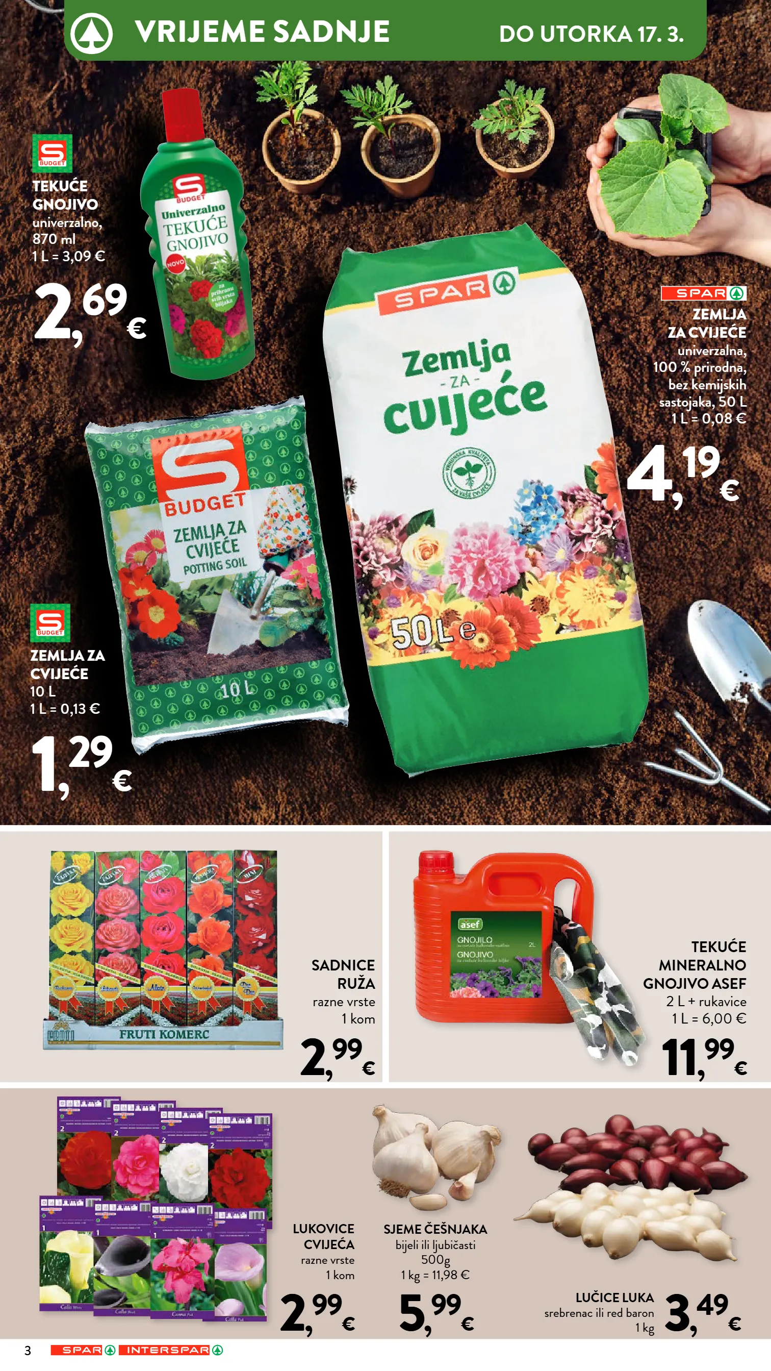 sjeme češnjaka bijeli ili ljubičasti 500g 1 kg = 11,98 € 5 , 99 € lučice luka srebrenac ili red baron 1 kg 3 , 49 € zemlja za cvijeće univerzalna, 100 % prirodna, bez kemijskih sastojaka, 50 l 1 l = 0,08 € 4 , 19 € zemlja za cvijeće 10 l 1 l = 0,13 € 1 , 29 € tekuće gnojivo univerzalno, 870 ml 1 l = 3,09 € 2 , 69 € sadnice ruža razne vrste 1 kom 2 , 99 € tekuće mineralno gnojivo asef 2 l + rukavice 1 l = 6,00 € 11 , 99 € lukovice cvijeća razne vrste 1 kom 2 , 99 € 3 text do utorka 17. 3. vrijeme sadnje do utorka 17. 3.