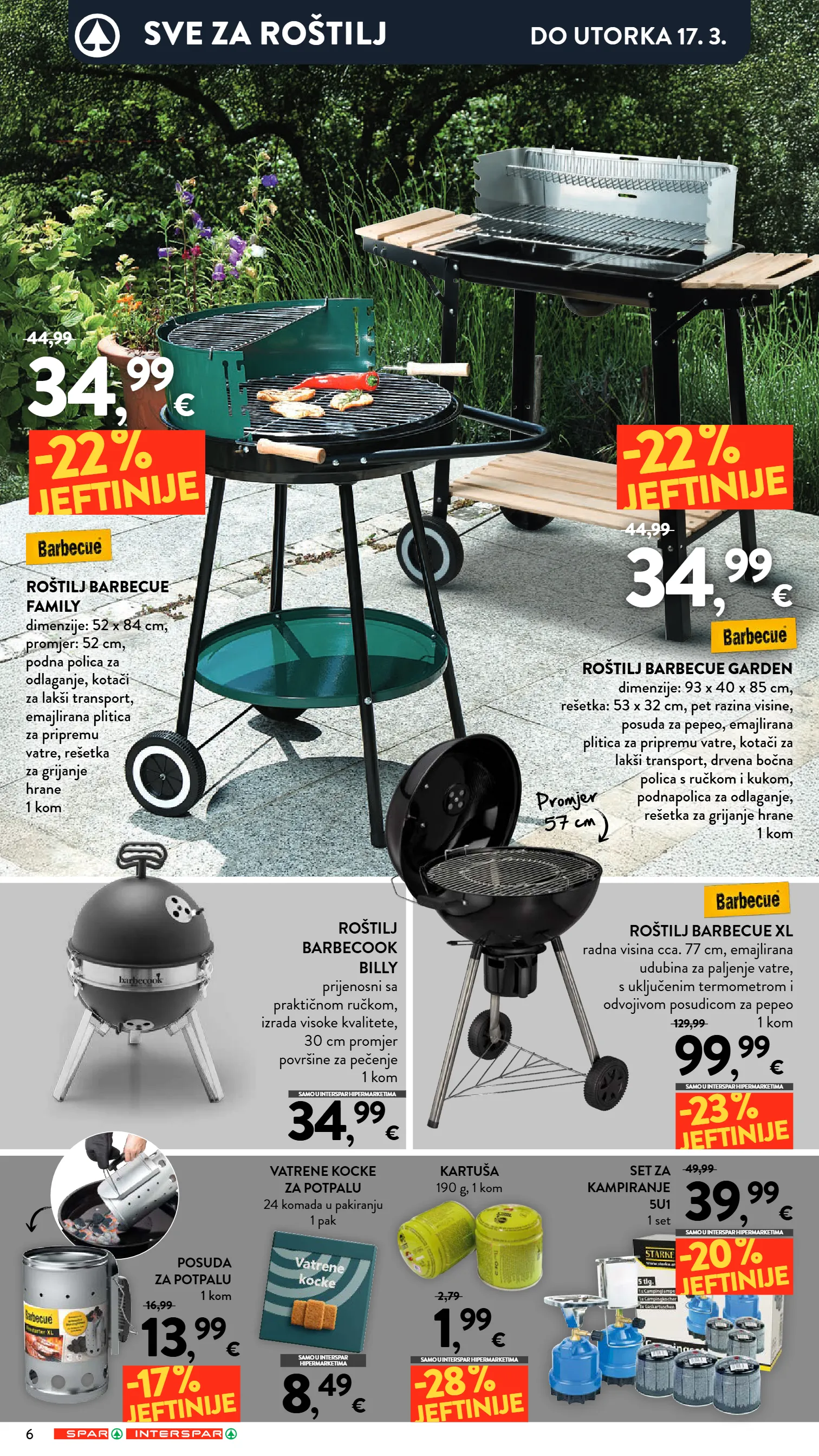 34 , 99 € 44,99 -22 % jeftinije roštilj barbecue family dimenzije: 52 x 84 cm, promjer: 52 cm, podna polica za odlaganje, kotači za lakši transport, emajlirana plitica za pripremu vatre, rešetka za grijanje hrane 1 kom roštilj barbecue xl radna visina cca. 77 cm, emajlirana udubina za paljenje vatre, s uključenim termometrom i odvojivom posudicom za pepeo 1 kom vatrene kocke za potpalu 24 komada u pakiranju 1 pak roštilj barbecue garden dimenzije: 93 x 40 x 85 cm, rešetka: 53 x 32 cm, pet razina visine, posuda za pepeo, emajlirana plitica za pripremu vatre, kotači za lakši transport, drvena bočna polica s ručkom i kukom, podnapolica za odlaganje, rešetka za grijanje hrane 1 kom 34 , 99 € 44,99 -22 % jeftinije promjer 57 cm roštilj barbecook billy prijenosni sa praktičnom ručkom, izrada visoke kvalitete, 30 cm promjer površine za pečenje 1 kom 34 , 99 € samo u interspar hipermarketima 99 , 99 € 129,99 -23 % jeftinije samo u interspar hipermarketima kartuša 190 g, 1 kom 1 , 99 € 2,79 -28 % jeftinije samo u interspar hipermarketima 8 , 49 € samo u interspar hipermarketima 39 , 99 € 49,99 -20 % jeftinije samo u interspar hipermarketima posuda za potpalu 1 kom 13 , 99 € 16,99 -17 % jeftinije set za kampiranje 5u1 1 set 6 sve za roštilj do utorka 17. 3.