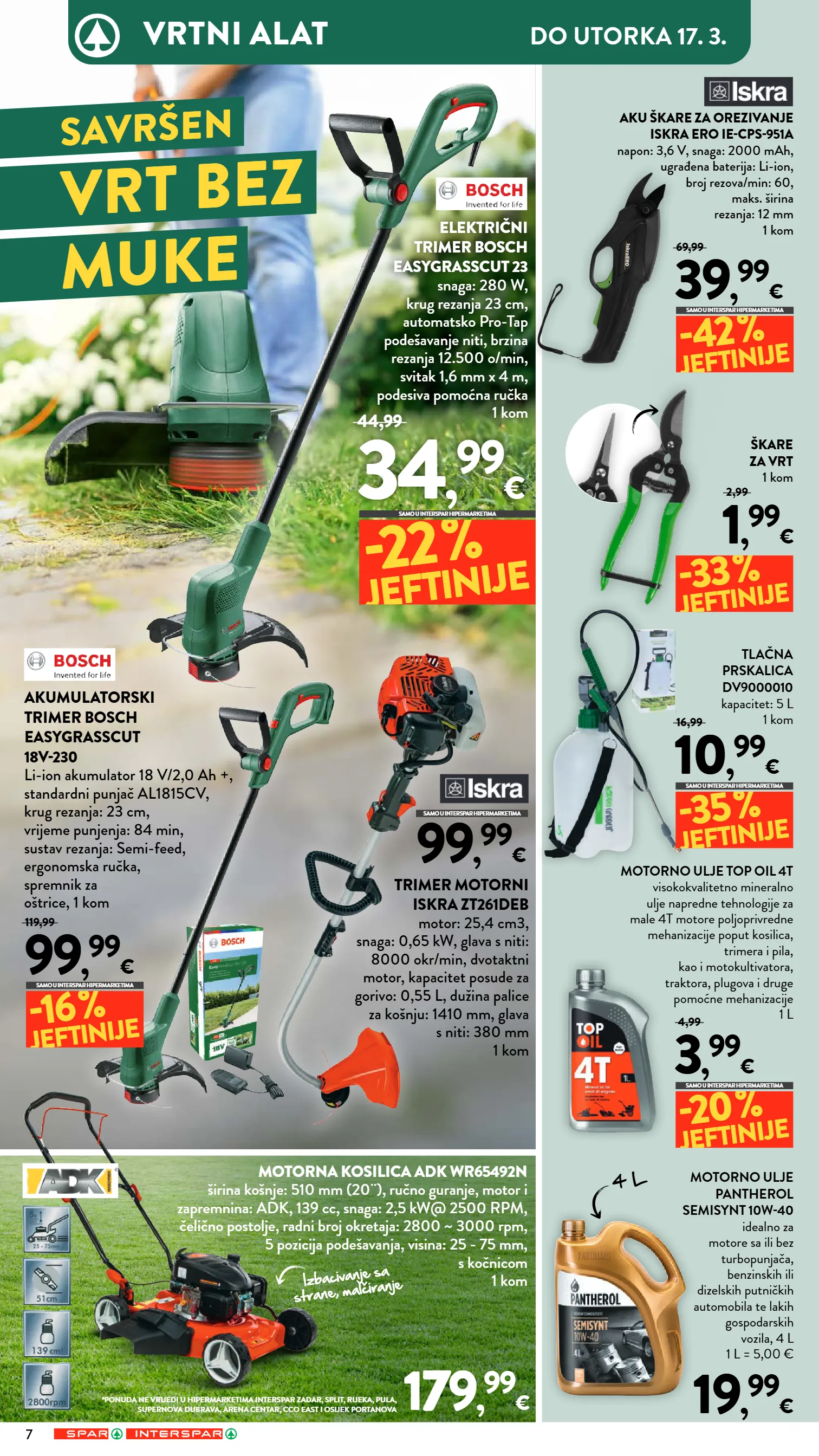 škare za vrt 1 kom 1 , 99 € 2,99 -33 % jeftinije motorno ulje pantherol semisynt 10w-40 idealno za motore sa ili bez turbopunjača, benzinskih ili dizelskih putničkih automobila te lakih gospodarskih vozila, 4 l 1 l = 5,00 € 19 , 99 € trimer motorni iskra zt261deb motor: 25,4 cm3, snaga: 0,65 kw, glava s niti: 8000 okr/min, dvotaktni motor, kapacitet posude za gorivo: 0,55 l, dužina palice za košnju: 1410 mm, glava s niti: 380 mm 1 kom motorna kosilica adk wr65492n širina košnje: 510 mm (20¨), ručno guranje, motor i zapremnina: adk, 139 cc, snaga: 2,5 kw@ 2500 rpm, čelično postolje, radni broj okretaja: 2800 ~ 3000 rpm, 5 pozicija podešavanja, visina: 25 - 75 mm, s kočnicom 1 kom *ponuda ne vrijedi u hipermarketima interspar zadar, split, rijeka, pula, supernova dubrava, arena centar, cco east i osijek portanova savršen vrt bez muke 4 l izbacivanje sa strane, malčiranje električni trimer bosch easygrasscut 23 snaga: 280 w, krug rezanja 23 cm, automatsko pro-tap podešavanje niti, brzina rezanja 12.500 o/min, svitak 1,6 mm x 4 m, podesiva pomoćna ručka 1 kom 34 , 99 € 44,99 -22 % jeftinije samo u interspar hipermarketima aku škare za orezivanje iskra ero ie-cps-951a napon: 3,6 v, snaga: 2000 mah, ugrađena baterija: li-ion, broj rezova/min: 60, maks. širina rezanja: 12 mm 1 kom -42 % jeftinije 39 , 99 € 69,99 samo u interspar hipermarketima tlačna prskalica dv9000010 kapacitet: 5 l 1 kom 10 , 99 € 16,99 -35 % jeftinije samo u interspar hipermarketima akumulatorski trimer bosch easygrasscut 18v-230 li-ion akumulator 18 v/2,0 ah +, standardni punjač al1815cv, krug rezanja: 23 cm, vrijeme punjenja: 84 min, sustav rezanja: semi-feed, ergonomska ručka, spremnik za oštrice, 1 kom 99 , 99 € 119,99 -16 % jeftinije samo u interspar hipermarketima 99 , 99 € samo u interspar hipermarketima motorno ulje top oil 4t visokokvalitetno mineralno ulje napredne tehnologije za male 4t motore poljoprivredne mehanizacije poput kosilica, trimera i pila, kao i motokultivatora, traktora, plugova i druge pomoćne mehanizacije 1 l 3 , 99 € 4,99 -20 % jeftinije samo u interspar hipermarketima 1 7 9 , 99 € 7 text do utorka 17. 3. vrtni alat do utorka 17. 3.