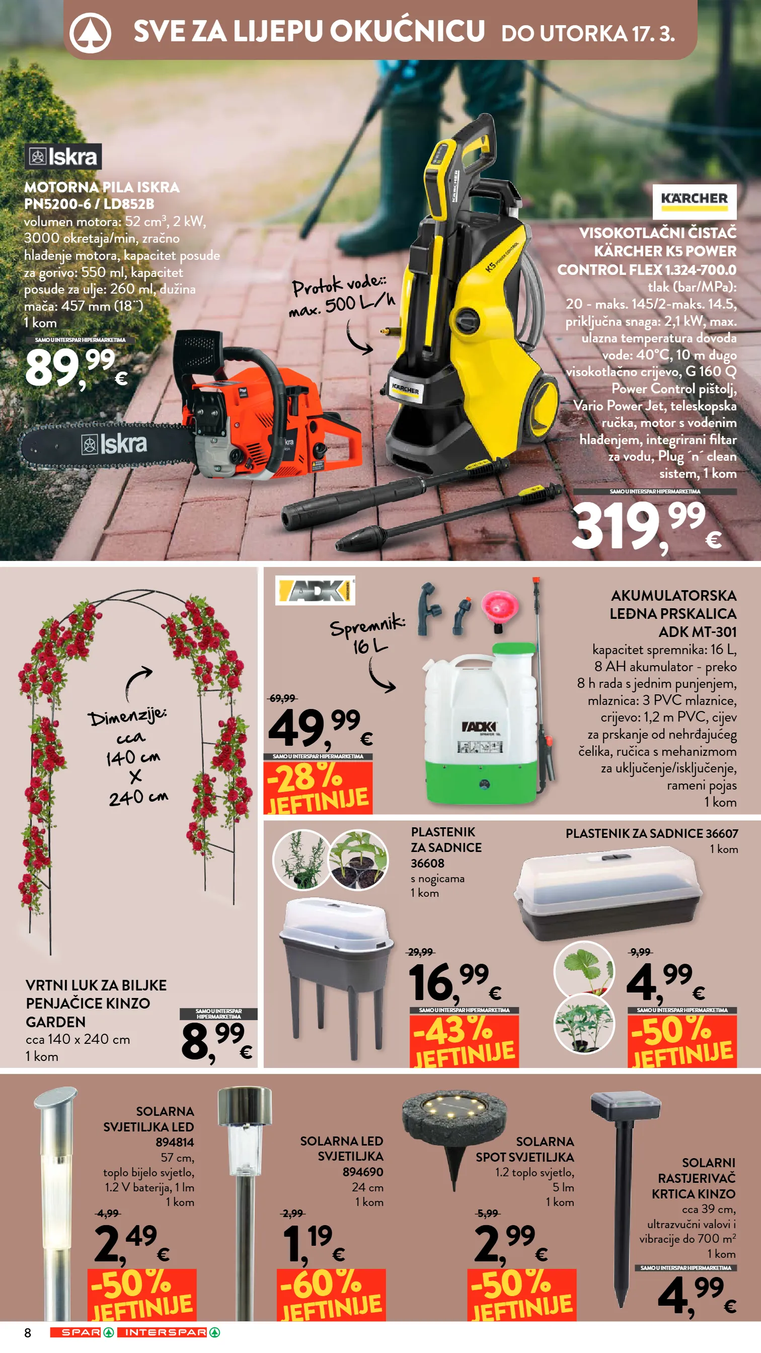 solarna svjetiljka led 894814 57 cm, toplo bijelo svjetlo, 1.2 v baterija, 1 lm 1 kom solarna led svjetiljka 894690 24 cm 1 kom solarna spot svjetiljka 1.2 toplo svjetlo, 5 lm 1 kom plastenik za sadnice 36607 1 kom akumulatorska leđna prskalica adk mt-301 kapacitet spremnika: 16 l, 8 ah akumulator - preko 8 h rada s jednim punjenjem, mlaznica: 3 pvc mlaznice, crijevo: 1,2 m pvc, cijev za prskanje od nehrđajućeg čelika, ručica s mehanizmom za uključenje/isključenje, rameni pojas 1 kom 49 , 99 € 69,99 -28 % jeftinije plastenik za sadnice 36608 s nogicama 1 kom motorna pila iskra pn5200-6 / ld852b volumen motora: 52 cm 3 , 2 kw, 3000 okretaja/min, zračno hlađenje motora, kapacitet posude za gorivo: 550 ml, kapacitet posude za ulje: 260 ml, dužina mača: 457 mm (18¨) 1 kom protok vode:: max. 500 l/h dimenzije: cca. 140 cm x 240 cm spremnik: 16 l visokotlačni čistač kärcher k5 power control flex 1.324-700.0 tlak (bar/mpa): 20 - maks. 145/2-maks. 14.5, priključna snaga: 2,1 kw, max. ulazna temperatura dovoda vode: 40°c, 10 m dugo visokotlačno crijevo, g 160 q power control pištolj, vario power jet, teleskopska ručka, motor s vodenim hlađenjem, integrirani filtar za vodu, plug ´n´ clean sistem, 1 kom 319 , 99 € samo u interspar hipermarketima 4 , 99 € 9,99 -50 % jeftinije samo u interspar hipermarketima samo u interspar hipermarketima 16 , 99 € 29,99 -43 % jeftinije samo u interspar hipermarketima samo u interspar hipermarketima 2 , 49 € 4,99 -50 % jeftinije 1 , 19 € 2,99 -60 % jeftinije 2 , 99 € 5,99 -50 % jeftinije vrtni luk za biljke penjačice kinzo garden cca 140 x 240 cm 1 kom 8 , 99 € samo u interspar hipermarketima samo u interspar hipermarketima 89 , 99 € 4 , 99 € solarni rastjerivač krtica kinzo cca 39 cm, ultrazvučni valovi i vibracije do 700 m 2 1 kom 8 sve za lijepu okućnicu do utorka 17. 3.