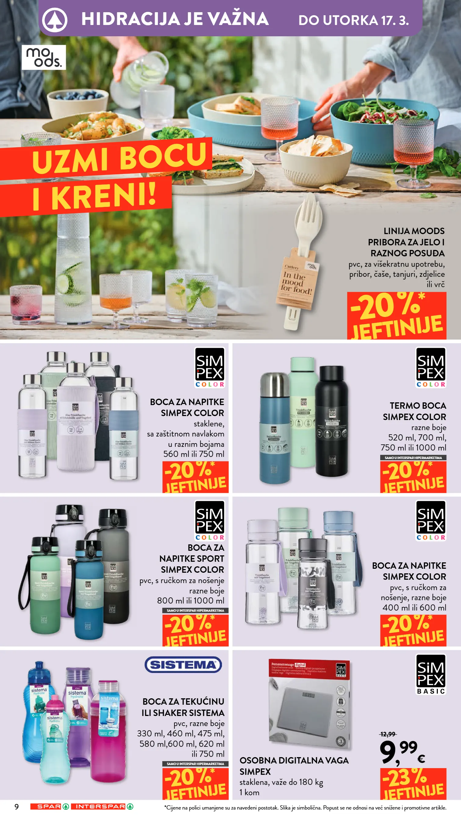 linija moods pribora za jelo i raznog posuđa pvc, za višekratnu upotrebu, pribor, čaše, tanjuri, zdjelice ili vrč -20 % * jeftinije osobna digitalna vaga simpex staklena, važe do 180 kg 1 kom 9 , 99 € 12,99 -23 % jeftinije boca za tekućinu ili shaker sistema pvc, razne boje 330 ml, 460 ml, 475 ml, 580 ml,600 ml, 620 ml ili 750 ml -20 % * jeftinije termo boca simpex color razne boje 520 ml, 700 ml, 750 ml ili 1000 ml -20 % * jeftinije -20 % * jeftinije boca za napitke sport simpex color pvc, s ručkom za nošenje razne boje 800 ml ili 1000 ml -20 % * jeftinije boca za napitke simpex color staklene, sa zaštitnom navlakom u raznim bojama 560 ml ili 750 ml -20 % * jeftinije uzmi bocu i kreni! *cijene na polici umanjene su za navedeni postotak. slika je simbolična. popust se ne odnosi na već snižene i promotivne artikle. boca za napitke simpex color pvc, s ručkom za nošenje, razne boje 400 ml ili 600 ml samo u interspar hipermarketima samo u interspar hipermarketima samo u interspar hipermarketima 9 hidracija je važna do utorka 17. 3.