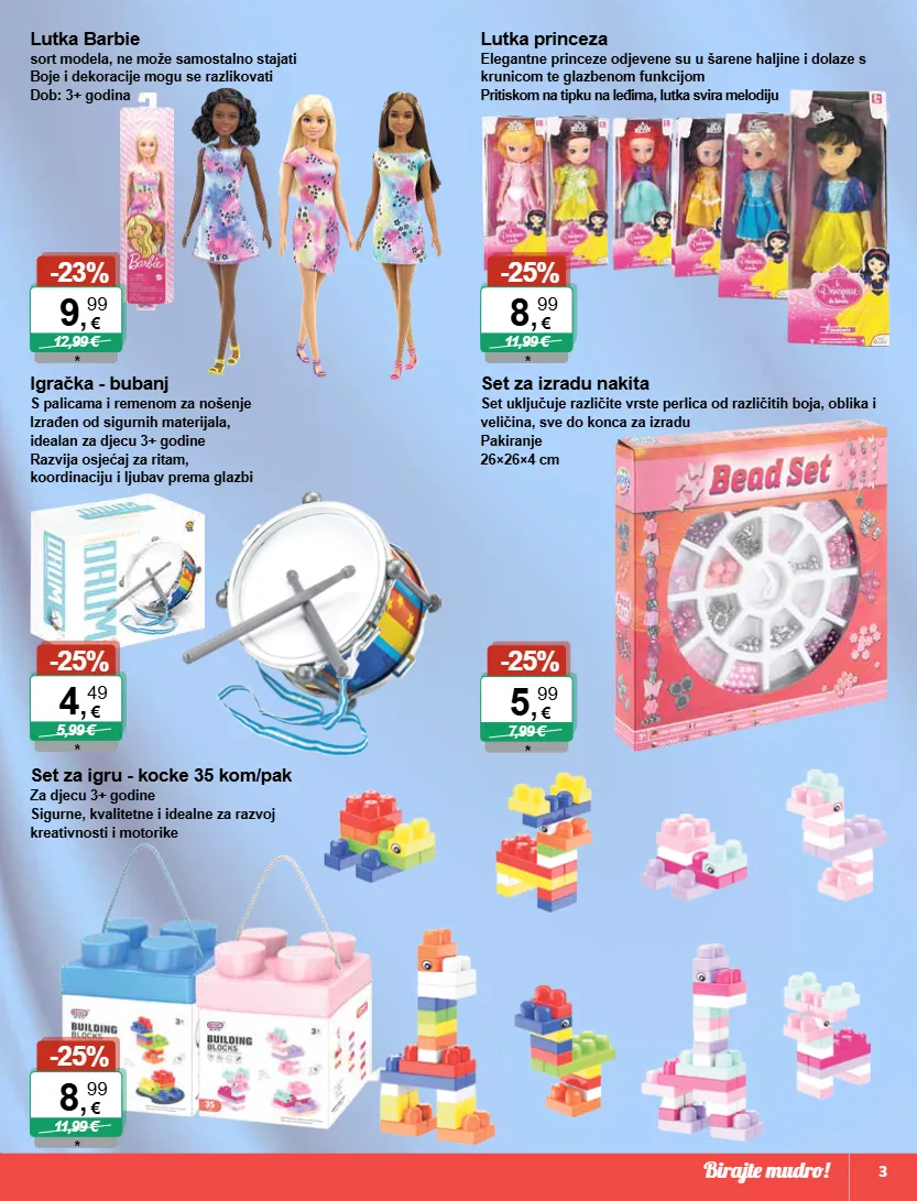-25% 5,99 € 4 , 49 * € -25% 11,99 € 8 , 99 * € -25% 7,99 € 5 , 99 * € -23% 12,99 € 9 , 99 * € -25% 11,99 € 8 , 99 * € Birajte mudro! 3 Lutka Barbie sort modela, ne može samostalno stajati Boje i dekoracije mogu se razlikovati Dob: 3+ godina Lutka princeza Elegantne princeze odjevene su u šarene haljine i dolaze s krunicom te glazbenom funkcijom Pritiskom na tipku na leđima, lutka svira melodiju Igračka - bubanj S palicama i remenom za nošenje Izrađen od sigurnih materijala, idealan za djecu 3+ godine Razvija osjećaj za ritam, koordinaciju i ljubav prema glazbi Set za igru - kocke 35 kom/pak Za djecu 3+ godine Sigurne, kvalitetne i idealne za razvoj kreativnosti i motorike Set za izradu nakita Set uključuje različite vrste perlica od različitih boja, oblika i veličina, sve do konca za izradu Pakiranje 26×26×4 cm