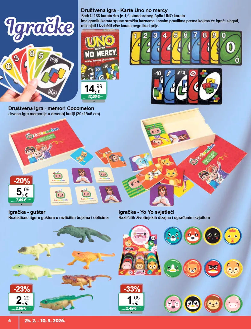 17,99 € 14 , 99 * € -23% 2,99 € 2 , 29 * € -20% 7,49 € 5 , 99 * € -33% 2,49 € 1 , 65 * € 25. 2. - 10. 3. 2026. 6 društvena igra - karte uno no mercy sadrži 168 karata što je 1,5 standardnog špila uno karata ima gomilu karata spuno strožim kaznama i novim pravilima prema kojima će igrači slagati, mijenjati i izvlačiti više karata nego ikad prije. igračka - gušter realistične figure guštera u različitim bojama i oblicima društvena igra - memori cocomelon drvena igra memorije u drvenoj kutiji (20×15×6 cm) igračka - yo yo svjetleći različitih životinjskih dizajna i ugrađenim svjetlom igračke