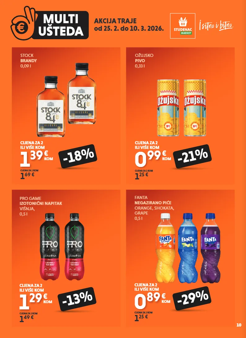 akcija traje od 25. 2. do 10. 3. 2026. 10 stock brandy 0,09 l 1 69 € cijena za 1 kom -18% cijena za 2 ili više kom ožujsko pivo 0,33 l 1 25 € cijena za 1 kom -21% cijena za 2 ili više kom pro game izotonični napitak višnja, 0,5 l 1 49 € cijena za 1 kom -13% cijena za 2 ili više kom fanta negazirano piće orange, shokata, grape 0,5 l 1 25 € cijena za 1 kom -29% cijena za 2 ili više kom 1 29 0 89 0 99 1 39 € kom € kom € kom € kom