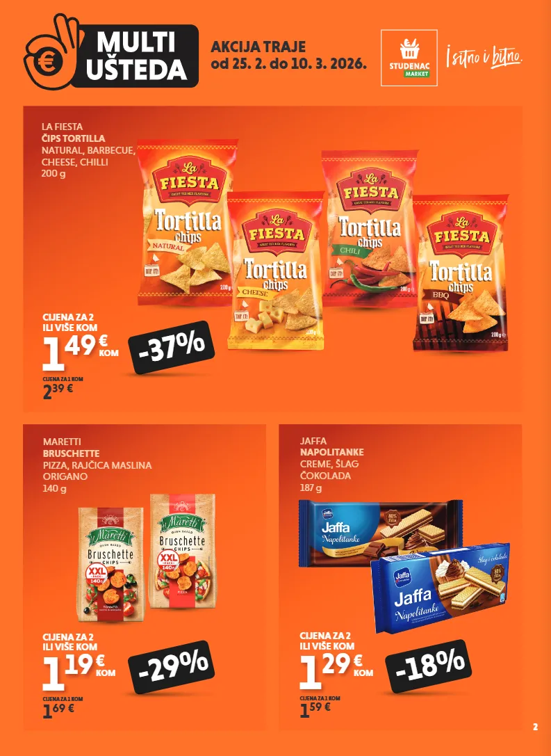 akcija traje od 25. 2. do 10. 3. 2026. 2 la fiesta čips tortilla natural, barbecue, cheese, chilli 200 g 1 49 2 39 € cijena za 1 kom -37% cijena za 2 ili više kom maretti bruschette pizza, rajčica maslina origano 140 g 1 19 1 69 € cijena za 1 kom -29% cijena za 2 ili više kom jaffa napolitanke creme, šlag čokolada 187 g 1 29 1 59 € cijena za 1 kom -18% cijena za 2 ili više kom € kom € kom € kom