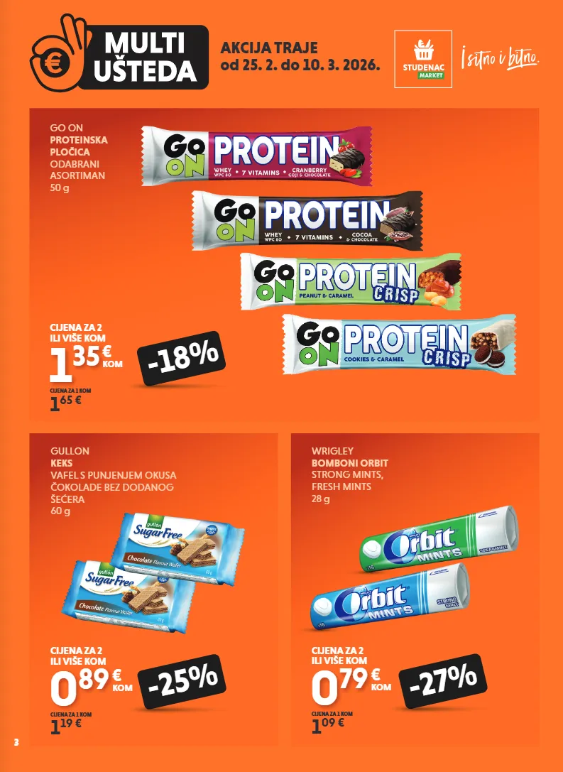 akcija traje od 25. 2. do 10. 3. 2026. 3 go on proteinska pločica odabrani asortiman 50 g 1 35 1 65 € cijena za 1 kom -18% cijena za 2 ili više kom gullon keks vafel s punjenjem okusa čokolade bez dodanog šećera 60 g 0 89 1 19 € cijena za 1 kom -25% cijena za 2 ili više kom wrigley bomboni orbit strong mints, fresh mints 28 g 0 79 1 09 € cijena za 1 kom -27% cijena za 2 ili više kom € kom € kom € kom