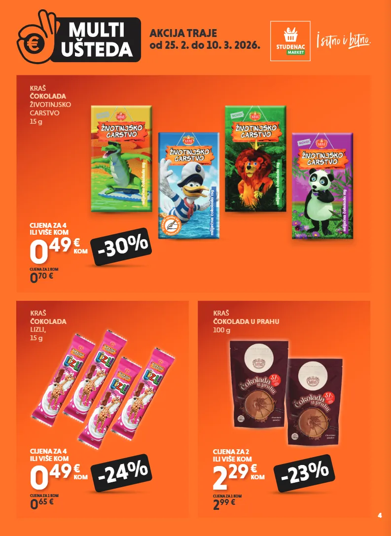 AKCIJA TRAJE od 25. 2. do 10. 3. 2026. 4 KRAŠ ČOKOLADA ŽIVOTINJSKO CARSTVO 15 g 0 49 0 70 € CIJENA ZA 1 KOM -30% CIJENA ZA 4 ILI VIŠE KOM KRAŠ ČOKOLADA LIZLI, 15 g 0 49 0 65 € CIJENA ZA 1 KOM -24% CIJENA ZA 4 ILI VIŠE KOM KRAŠ ČOKOLADA U PRAHU 100 g 2 29 2 99 € CIJENA ZA 1 KOM -23% CIJENA ZA 2 ILI VIŠE KOM € KOM € KOM € KOM