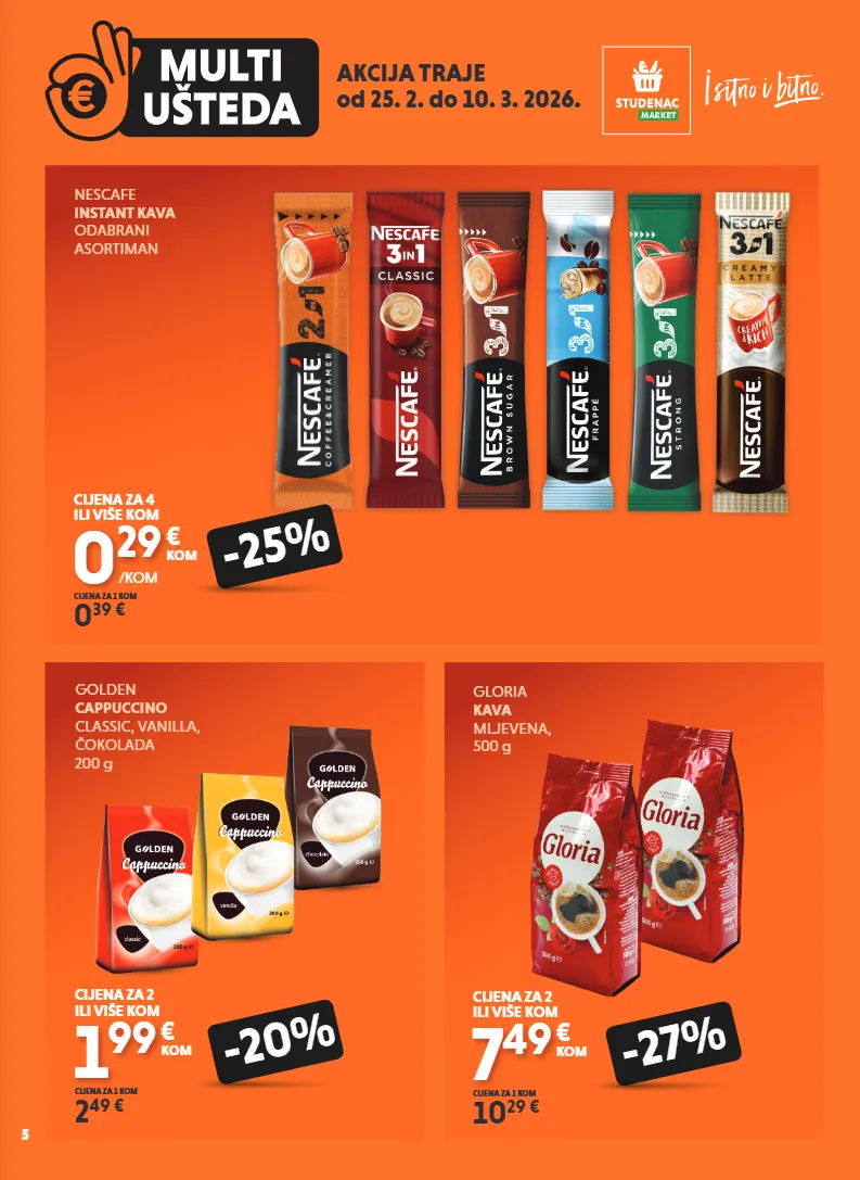 akcija traje od 25. 2. do 10. 3. 2026. 5 nescafe instant kava odabrani asortiman 0 29 0 39 € cijena za 1 kom -25% cijena za 4 ili više kom golden cappuccino classic, vanilla, čokolada 200 g 1 99 2 49 € cijena za 1 kom -20% cijena za 2 ili više kom gloria kava mljevena, 500 g 7 49 10 29 € cijena za 1 kom -27% cijena za 2 ili više kom /kom € kom € kom € kom