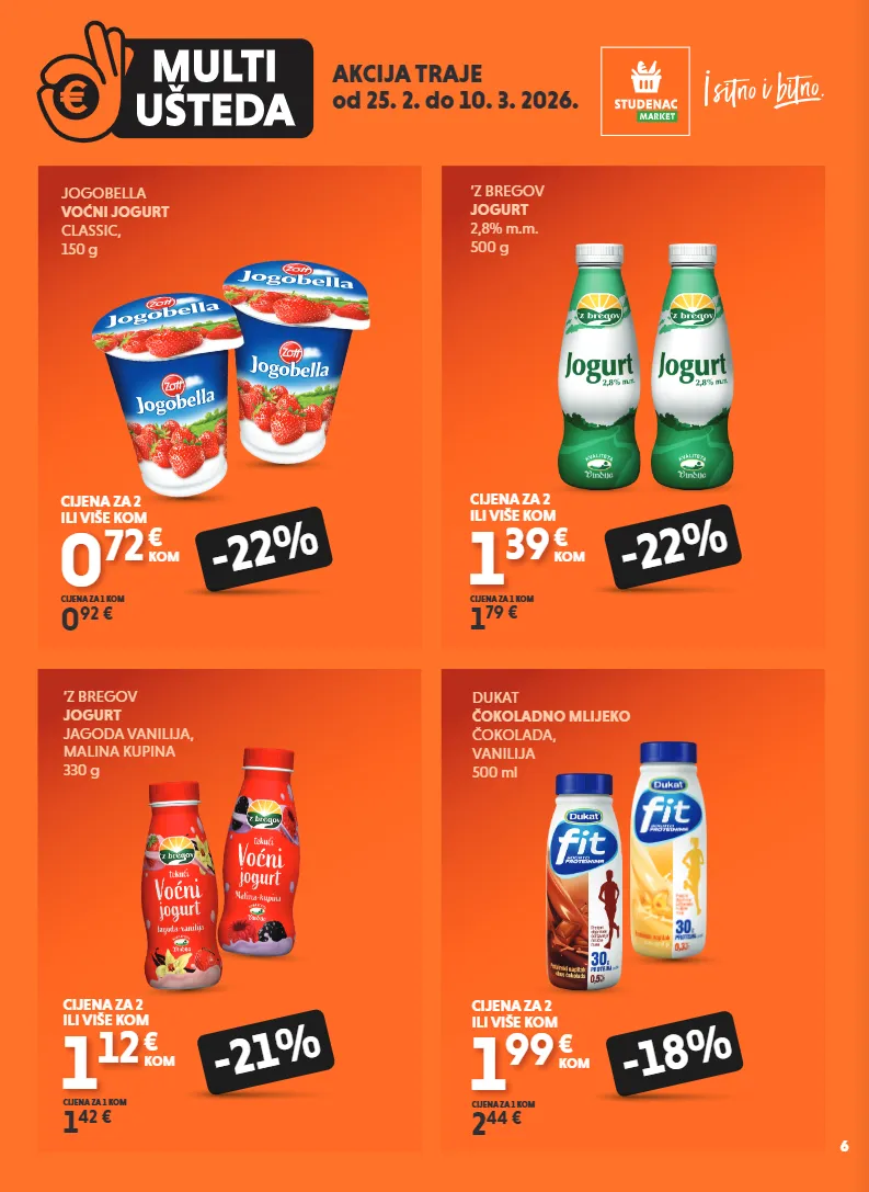 akcija traje od 25. 2. do 10. 3. 2026. 6 jogobella voćni jogurt classic, 150 g 0 72 0 92 € cijena za 1 kom -22% cijena za 2 ili više kom ‘z bregov jogurt 2,8% m.m. 500 g 1 39 1 79 € cijena za 1 kom -22% cijena za 2 ili više kom ‘z bregov jogurt jagoda vanilija, malina kupina 330 g 1 12 1 42 € cijena za 1 kom -21% cijena za 2 ili više kom dukat čokoladno mlijeko čokolada, vanilija 500 ml 1 99 2 44 € cijena za 1 kom -18% cijena za 2 ili više kom € kom € kom € kom € kom