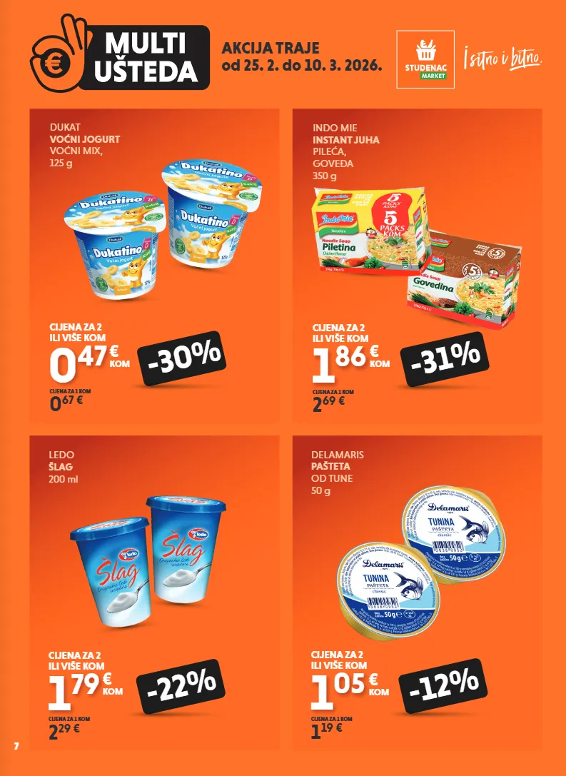 akcija traje od 25. 2. do 10. 3. 2026. 7 dukat voćni jogurt voćni mix, 125 g 0 47 0 67 € cijena za 1 kom -30% cijena za 2 ili više kom ledo šlag 200 ml 1 79 2 29 € cijena za 1 kom -22% cijena za 2 ili više kom indo mie instant juha pileća, goveđa 350 g 1 86 2 69 € cijena za 1 kom -31% cijena za 2 ili više kom delamaris pašteta od tune 50 g 1 05 1 19 € cijena za 1 kom -12% cijena za 2 ili više kom € kom € kom € kom € kom