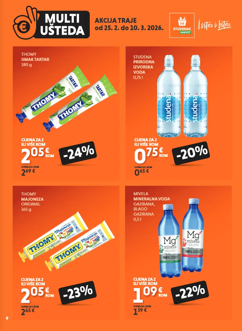 akcija traje od 25. 2. do 10. 3. 2026. 9 thomy majoneza original 165 g 2 05 2 65 € cijena za 1 kom -23% cijena za 2 ili više kom thomy umak tartar 180 g 2 05 2 69 € cijena za 1 kom -24% cijena za 2 ili više kom mivela mineralna voda gazirana, blago gazirana 0,5 l 1 09 1 39 € cijena za 1 kom -22% cijena za 2 ili više kom € kom € kom € kom studena prirodna izvorska voda 0,75 l 0 75 0 65 € cijena za 1 kom -20% cijena za 2 ili više kom € kom