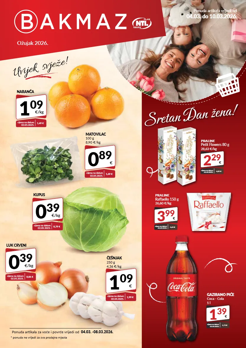 ponuda artikala za voće i povrće vrijedi od 04.03. -08.03.2026. * ponuda ne vrijedi za sva prodajna mjesta ožujak 2026. ponuda artikala vrijedi od 04.03. do 10.03.2026. cijena na datum 02.05.2025. 1,72 € 1 39 € gazirano piće coca - cola 1 l cijena na datum 02.05.2025. 1,49 € naranča 1 09 €/kg 2 29 € praline petit flowers 80 g 28,63 €/kg cijena na datum 02.05.2025. 4,35 € cijena na datum 02.05.2025. 0,84 € luk crveni 0 39 €/kg cijena na datum 02.05.2025. 1,99 € češnjak 250 g 4,36 €/kg 1 09 € cijena na datum 02.05.2025. 0,79 € kupus 0 39 €/kg cijena na datum 02.05.2025. 1,69 € matovilac 100 g 8,90 €/kg 0 89 € 3 99 € praline raffaello 150 g 26,60 €/kg cijena na datum 02.05.2025. 4,64 € sretan dan žena!