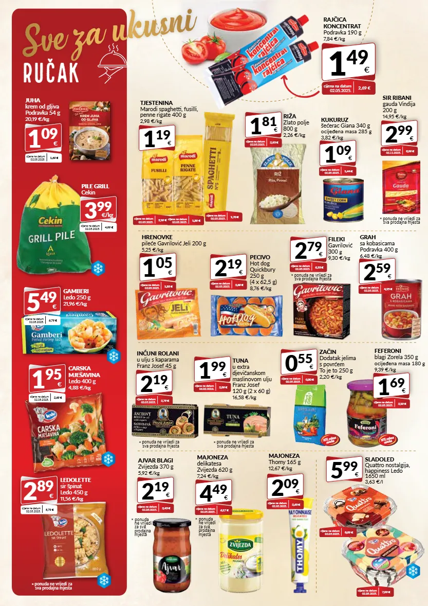 sve za ukusni ručak * ponuda ne vrijedi za sva prodajna mjesta * ponuda ne vrijedi za sva prodajna mjesta ntl robna marka ntl robna marka * ponuda ne vrijedi za sva prodajna mjesta 2 79 € fileki gavrilović 300 g 9,30 €/kg cijena na datum 02.05.2025. 3,55 € 2 19 € pecivo hot dog quickbury 250 g (4 x 62,5 g) 8,76 €/kg cijena na datum 02.05.2025. 2,69 € hrenovke pileće gavrilović jeli 200 g 5,25 €/kg 1 05 € cijena na datum 02.05.2025. 1,85 € 2 59 € grah sa kobasicama podravka 400 g 6,48 €/kg cijena na datum 02.05.2025. 4,25 € 2 99 € sir ribani gauda vindija 200 g 14,95 €/kg cijena na datum 02.11.2025. 3,99 € 1 81 € riža zlato polje 800 g 2,26 €/kg cijena na datum 02.05.2025. 2,95 € 1 09 € kukuruz šećerac giana 340 g ocijeđena masa 285 g 3,82 €/kg cijena na datum 02.05.2025. 1,44 € 0 55 € začin dodatak jelima s povrćem to je to 250 g 2,20 €/kg cijena na datum 02.05.2025. 0,80 € 1 69 € feferoni blagi zorela 350 g ocijeđena masa 180 g 9,39 €/kg cijena na datum 02.05.2025. 2,19 € 2 19 € inćuni rolani u ulju s kaparama franz josef 45 g cijena na datum 02.05.2025. 2,79 € 1 99 € tuna u extra djevičanskom maslinovom ulju franz josef 120 g (2 x 60 g) 16,58 €/kg cijena na datum 06.02.2026. 2,39 € 4 49 € majoneza delikatesa zvijezda 620 g 7,24 €/kg cijena na datum 02.05.2025. 6,17 € 2 09 € majoneza thomy 165 g 12,67 €/kg cijena na datum 02.05.2025. 2,65 € 2 19 € ajvar blagi zvijezda 370 g 5,92 €/kg cijena na datum 02.05.2025. 2,45 € carska mješavina ledo 400 g 4,88 €/kg 1 95 € cijena na datum 02.05.2025. 2,69 € 1 19 € tjestenina marodi spaghetti, fusilli, penne rigate 400 g 2,98 €/kg cijena na datum 02.05.2025. 2,19 € cijena na datum 02.05.2025. 1,89 € cijena na datum 02.05.2025. 1,70 € * ponuda ne vrijedi za sva prodajna mjesta * ponuda ne vrijedi za sva prodajna mjesta * ponuda ne vrijedi za sva prodajna mjesta * ponuda ne vrijedi za sva prodajna mjesta 5 99 € sladoled quattro nostalgija, happiness ledo 1650 ml 3,63 €/l cijena na datum 02.05.2025. 7,99 € cijena na datum 02.05.2025. 8,39 € 3 99 €/kg pile grill cekin cijena na datum 02.05.2025. 4,99 € juha krem od gljiva podravka 54 g 20,19 €/kg 1 09 € cijena na datum 02.05.2025. 1,69 € gamberi ledo 250 g 21,96 €/kg 5 49 € cijena na datum 02.05.2025. 6,79 € rajčica koncentrat podravka 190 g 7,84 €/kg 1 49 € cijena na datum 02.05.2025. 2,69 € ledolette sir špinat ledo 450 g 11,56 €/kg 2 89 € cijena na datum 02.05.2025. 5,79 €