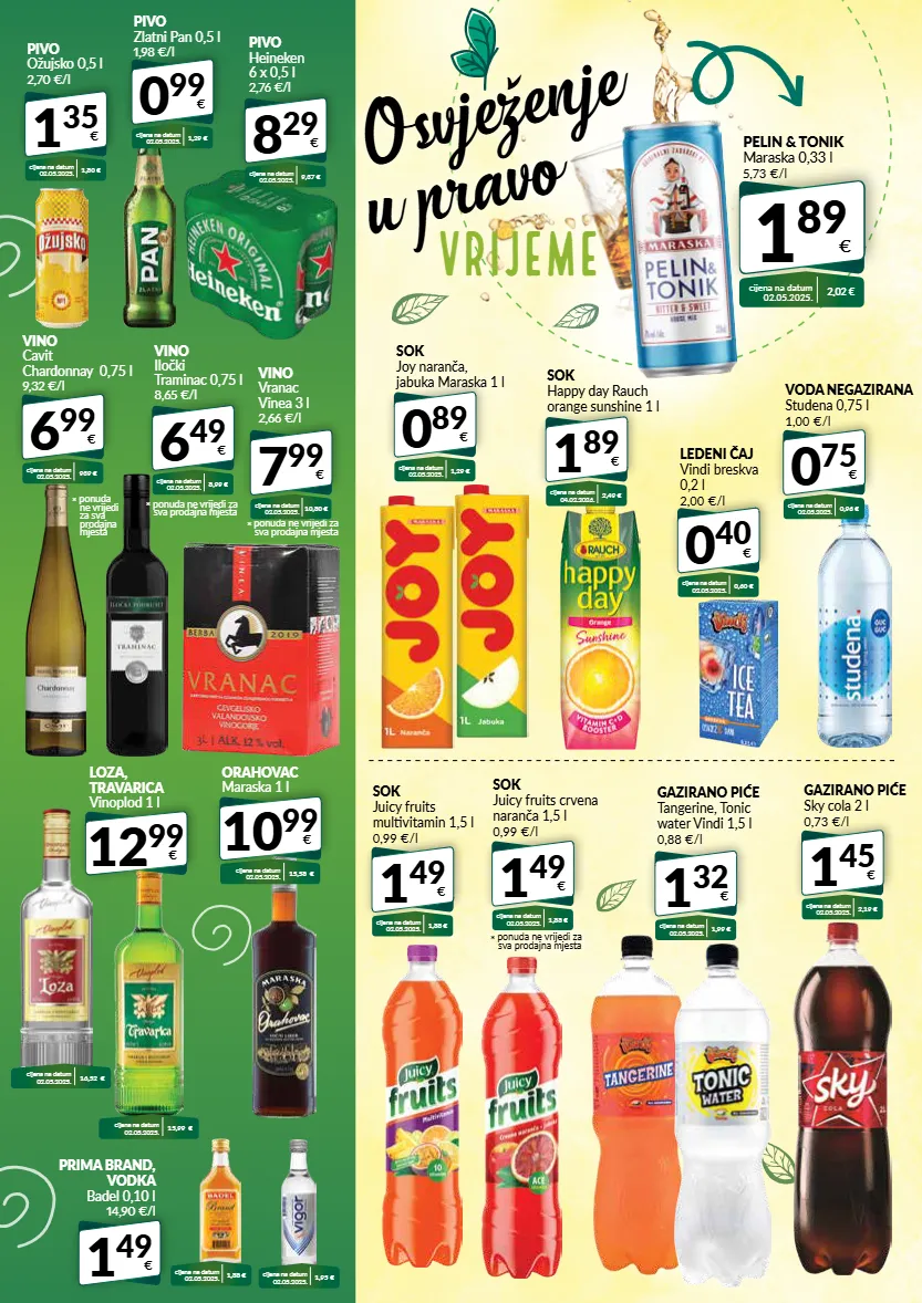 * ponuda ne vrijedi za sva prodajna mjesta osvježenje u pravo vrijeme pelin & tonik maraska 0,33 l 5,73 €/l 1 89 € cijena na datum 02.05.2025. 2,02 € sok joy naranča, jabuka maraska 1 l 0 89 € cijena na datum 02.05.2025. 1,29 € sok happy day rauch orange sunshine 1 l 1 89 € cijena na datum 04.02.2026. 2,49 € voda negazirana studena 0,75 l 1,00 €/l 0 75 € cijena na datum 02.05.2025. 0,96 € ledeni čaj vindi breskva 0,2 l 2,00 €/l 0 40 € cijena na datum 02.05.2025. 0,60 € sok juicy fruits multivitamin 1,5 l 0,99 €/l 1 49 € cijena na datum 02.05.2025. 1,88 € * ponuda ne vrijedi za sva prodajna mjesta sok juicy fruits crvena naranča 1,5 l 0,99 €/l 1 49 € cijena na datum 02.05.2025. 1,88 € gazirano piće tangerine, tonic water vindi 1,5 l 0,88 €/l 1 32 € cijena na datum 02.05.2025. 1,99 € gazirano piće sky cola 2 l 0,73 €/l 1 45 € cijena na datum 02.05.2025. 2,19 € * ponuda ne vrijedi za sva prodajna mjesta 6 49 € vino iločki traminac 0,75 l 8,65 €/l cijena na datum 02.05.2025. 8,99 € 6 99 € vino cavit chardonnay 0,75 l 9,32 €/l cijena na datum 02.05.2025. 939 € 1 49 € prima brand, vodka badel 0,10 l 14,90 €/l cijena na datum 02.05.2025. 1,95 € cijena na datum 02.05.2025. 1,88 € cijena na datum 02.05.2025. 15,99 € cijena na datum 02.05.2025. 16,52 € 12 99 € loza, travarica vinoplod 1 l 10 99 € cijena na datum 02.05.2025. 15,58 € orahovac maraska 1 l 0 99 € pivo zlatni pan 0,5 l 1,98 €/l cijena na datum 02.05.2025. 1,29 € 1 35 € pivo ožujsko 0,5 l 2,70 €/l cijena na datum 02.05.2025. 1,80 € 8 29 € pivo heineken 6 x 0,5 l 2,76 €/l cijena na datum 02.05.2025. 9,37 € * ponuda ne vrijedi za sva prodajna mjesta 7 99 € vino vranac vinea 3 l 2,66 €/l cijena na datum 02.05.2025. 10,80 €