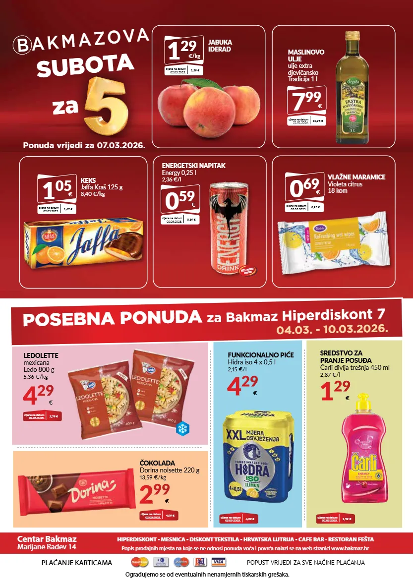 ponuda vrijedi za 07.03.2026. kapsule macchiato, cappuccino franck 198 g 161,56 kn/kg 21,44 €/kg 31 99 kn 4,25 € plaćanje karticama ograđujemo se od eventualnih nenamjernih tiskarskih grešaka. popust vrijedi za sve načine plaćanja centar bakmaz marijane radev 14 hiperdiskont • mesnica • diskont tekstila • hrvatska lutrija • cafe bar - restoran fešta popis prodajnih mjesta na koje se ne odnosi ponuda voća i povrća nalazi se na web stranici www.bakmaz.hr 04.03. - 10.03.2026. posebna ponuda za bakmaz hiperdiskont 7 cijena na datum 02.05.2025. 5,79 € ledolette mexicana ledo 800 g 5,36 €/kg 4 29 € energetski napitak energy 0,25 l 2,36 €/l 0 59 € cijena na datum 02.05.2025. 0,89 € keks jaffa kraš 125 g 8,40 €/kg 1 05 € cijena na datum 02.05.2025. 1,67 € maslinovo ulje ulje extra djevičansko tradicija 1 l 7 99 € cijena na datum 21.01.2026. 10,95 € sredstvo za pranje posuđa čarli divlja trešnja 450 ml 2,87 €/l 1 29 € funkcionalno piće hidra iso 4 x 0,5 l 2,15 €/l 4 29 € cijena na datum 02.05.2025. 1,59 € cijena na datum 05.09.2025. 4,99 € čokolada dorina noisette 220 g 13,59 €/kg 2 99 € cijena na datum 02.05.2025. 4,99 € b a k m a z o va subota za vlažne maramice violeta citrus 18 kom 0 69 € cijena na datum 02.05.2025. 0,95 € jabuka iderad 1 29 €/kg cijena na datum 02.05.2025. 1,59 € ntl robna marka