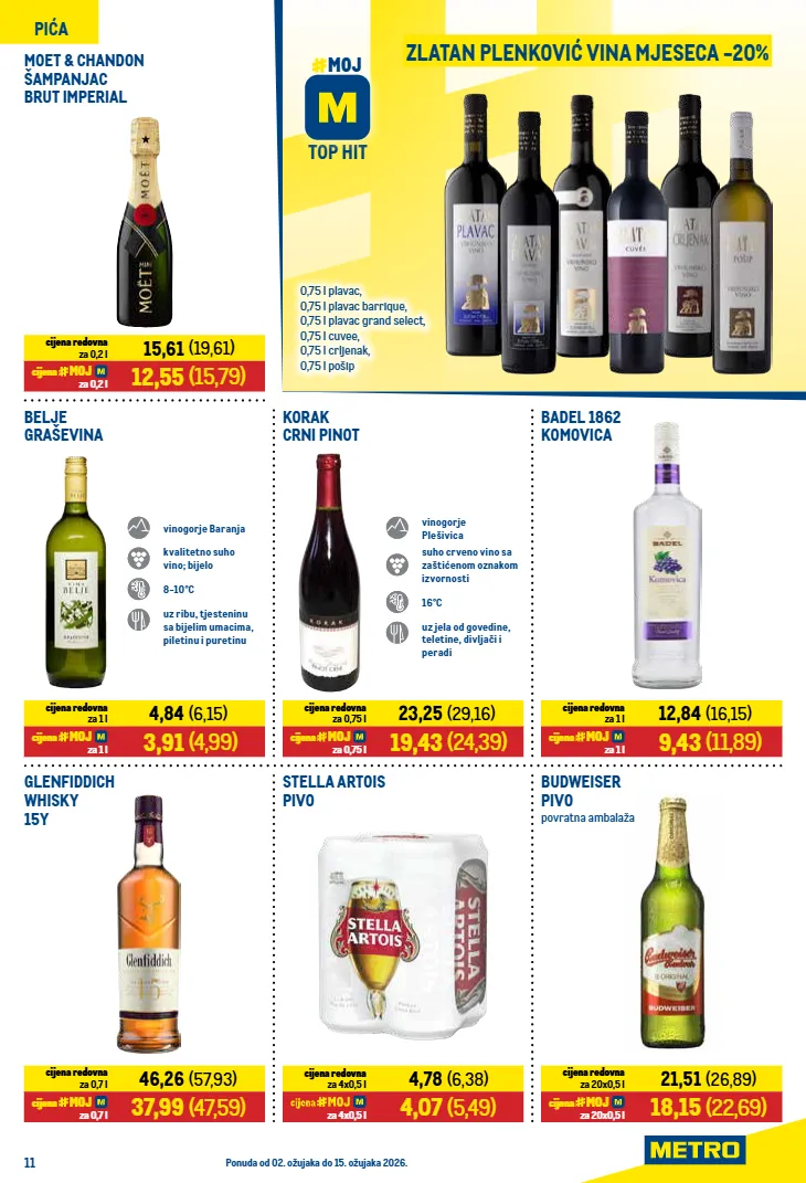 11 ponuda od 02. ožujaka do 15. ožujaka 2026. glenfiddich whisky 15y badel 1862 komovica korak crni pinot belje graševina 0,75 l plavac, 0,75 l plavac barrique, 0,75 l plavac grand select, 0,75 l cuvee, 0,75 l crljenak, 0,75 l pošip moet & chandon šampanjac brut imperial stella artois pivo zlatan plenković vina mjeseca -20% budweiser pivo povratna ambalaža top hit moj cijena redovna za 0,75 l 23,25 (29,16) cijena moj za 0,75 l 19,43 (24,39) cijena redovna za 0,7 l 46,26 (57,93) cijena moj za 0,7 l 37,99 (47,59) cijena redovna za 1 l 12,84 (16,15) cijena moj za 1 l 9,43 (11,89) cijena redovna za 4x0,5 l 4,78 (6,38) za 4x0,5 l 4,07 (5,49) cijena redovna za 1 l 4,84 (6,15) cijena moj za 1 l 3,91 (4,99) cijena redovna za 0,2 l 15,61 (19,61) cijena moj za 0,2 l 12,55 (15,79) cijena redovna za 20x0,5 l 21,51 (26,89) cijena moj za 20x0,5 l 18,15 (22,69) pića vinogorje baranja kvalitetno suho vino; bijelo 8-10°c uz ribu, tjesteninu sa bijelim umacima, piletinu i puretinu vinogorje plešivica suho crveno vino sa zaštićenom oznakom izvornosti 16°c uz jela od govedine, teletine, divljači i peradi