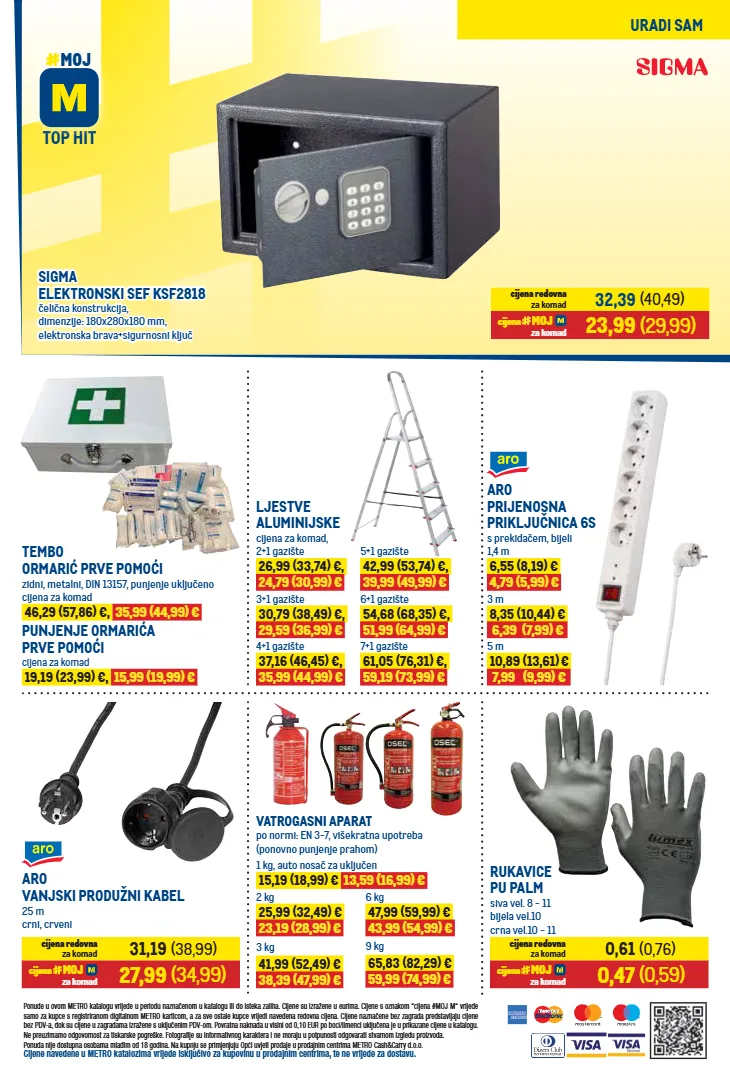 top hit moj cijena redovna za komad 0,61 (0,76) cijena moj za komad 0,47 (0,59) rukavice pu palm siva vel. 8 - 11 bijela vel.10 crna vel.10 - 11 sigma elektronski sef ksf2818 čelična konstrukcija, dimenzije: 180x280x180 mm, elektronska brava+sigurnosni ključ cijena redovna za komad 32,39 (40,49) cijena moj za komad 23,99 (29,99) tembo ormarić prve pomoći zidni, metalni, din 13157, punjenje uključeno cijena za komad 46,29 (57,86) €, 35,99 (44,99) € punjenje ormarića prve pomoći cijena za komad 19,19 (23,99) €, 15,99 (19,99) € ljestve aluminijske cijena za komad, 2+1 gazište 26,99 (33,74) €, 24,79 (30,99) € 3+1 gazište 30,79 (38,49) €, 29,59 (36,99) € 4+1 gazište 37,16 (46,45) €, 35,99 (44,99) € 5+1 gazište 42,99 (53,74) €, 39,99 (49,99) € 6+1 gazište 54,68 (68,35) €, 51,99 (64,99) € 7+1 gazište 61,05 (76,31) €, 59,19 (73,99) € aro prijenosna priključnica 6s s prekidačem, bijeli 1,4 m 6,55 (8,19) € 4,79 (5,99) € 3 m 8,35 (10,44) € 6,39 (7,99) € 5 m 10,89 (13,61) € 7,99 (9,99) € aro vanjski produžni kabel 25 m crni, crveni cijena redovna za komad 31,19 (38,99) cijena moj za komad 27,99 (34,99) uradi sam ponude u ovom metro katalogu vrijede u periodu naznačenom u katalogu ili do isteka zaliha. cijene su izražene u eurima. cijene s oznakom “cijena #moj m“ vrijede samo za kupce s registriranom digitalnom metro karticom, a za sve ostale kupce vrijedi navedena redovna cijena. cijene naznačene bez zagrada predstavljaju cijene bez pdv-a, dok su cijene u zagradama izražene s uključenim pdv-om. povratna naknada u visini od 0,10 eur po boci/limenci uključena je u prikazane cijene u katalogu. ne preuzimamo odgovornost za tiskarske pogreške. fotografije su informativnog karaktera i ne moraju u potpunosti odgovarati stvarnom izgledu proizvoda. ponuda nije dostupna osobama mlađim od 18 godina. na kupnju se primjenjuju opći uvjeti prodaje u prodajnim centrima metro cash&carry d.o.o. cijene navedene u metro katalozima vrijede isključivo za kupovinu u prodajnim centrima, te ne vrijede za dostavu. vatrogasni aparat po normi: en 3-7, višekratna upotreba (ponovno punjenje prahom) 1 kg, auto nosač za uključen 15,19 (18,99) € 13,59 (16,99) € 2 kg 25,99 (32,49) € 23,19 (28,99) € 3 kg 41,99 (52,49) € 38,39 (47,99) € 6 kg 47,99 (59,99) € 43,99 (54,99) € 9 kg 65,83 (82,29) € 59,99 (74,99) €