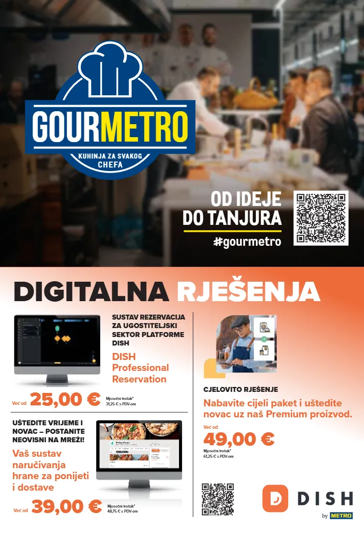 gourmetro kuhinja za svakog chefa #gourmetro od ideje do tanjura otkrij dish rješenja i istakni se od ostalih svojim personaliziranim menijem, web stranicom ili online oglasima. kad želiš pratiti trendove, a istovremeno ostati svoj. dish rješenja – di’š bolje. digitalna rješenja cjelovito rješenje nabavite cijeli paket i uštedite novac uz naš premium proizvod. 49,00 € već od mjesečni trošak* 61,25 € s pdv-om sustav rezervacija za ugostiteljski sektor platforme dish dish professional reservation uštedite vrijeme i novac – postanite neovisni na mreži! vaš sustav naručivanja hrane za ponijeti i dostave 25,00 € 39,00 € već od već od mjesečni trošak* 31,25 € s pdv-om mjesečni trošak* 48,75 € s pdv-om