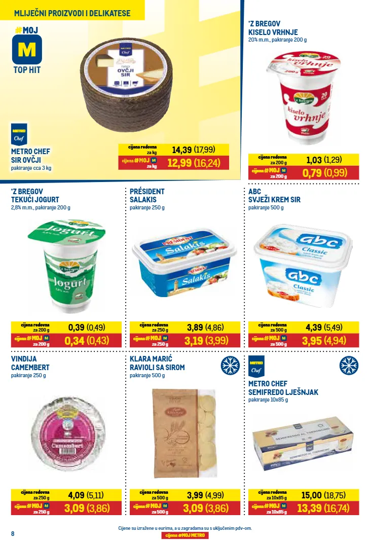 8 cijene su izražene u eurima, a u zagradama su s uključenim pdv-om. cijena # moj metro metro chef semifredo lješnjak pakiranje 10x85 g klara marić ravioli sa sirom pakiranje 500 g vindija camembert pakiranje 250 g ‘z bregov tekući jogurt 2,8% m.m., pakiranje 200 g président salakis pakiranje 250 g abc svježi krem sir pakiranje 500 g ‘z bregov kiselo vrhnje 20% m.m., pakiranje 200 g metro chef sir ovčji pakiranje cca 3 kg top hit moj cijena redovna za kg 14,39 (17,99) za kg 12,99 (16,24) cijena redovna za 200 g 1,03 (1,29) cijena moj za 200 g 0,79 (0,99) cijena redovna za 200 g 0,39 (0,49) cijena moj za 200 g 0,34 (0,43) cijena redovna za 250 g 3,89 (4,86) cijena moj za 250 g 3,19 (3,99) cijena redovna za 500 g 4,39 (5,49) cijena moj za 500 g 3,95 (4,94) cijena redovna za 250 g 4,09 (5,11) cijena moj za 250 g 3,09 (3,86) cijena redovna za 500 g 3,99 (4,99) cijena moj za 500 g 3,09 (3,86) cijena redovna za 10x85 g 15,00 (18,75) cijena moj za 10x85 g 13,39 (16,74) mliječni proizvodi i delikatese